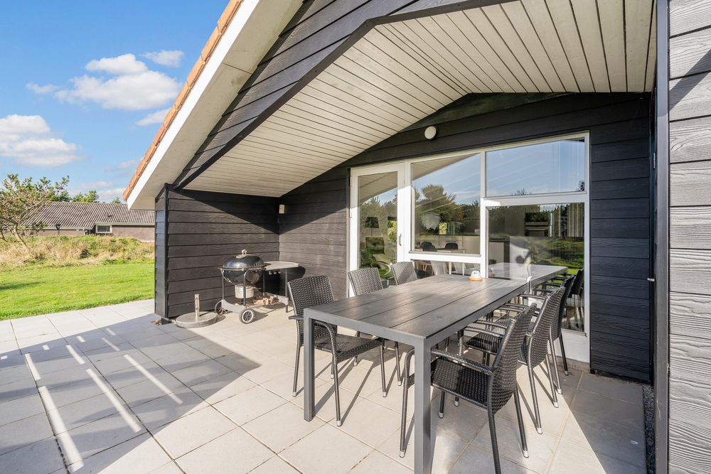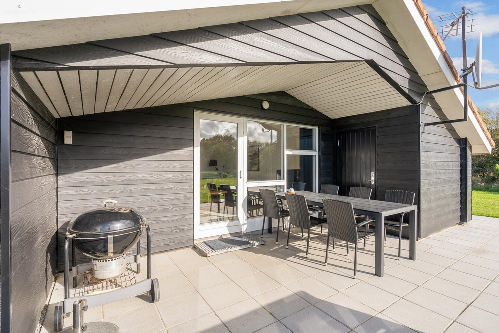 Vom Wohnbereich aus kommt man auf eine schöne überdachte Terrasse mit Gartenmöbeln. Hier könnt ihr nach einem Tag am Strand oder in der Natur euer Abendessen auf dem Grill zubereiten.