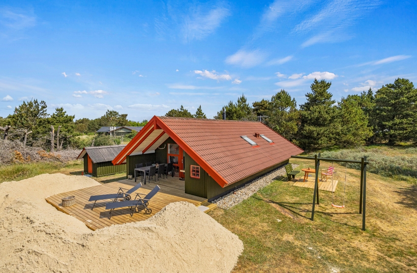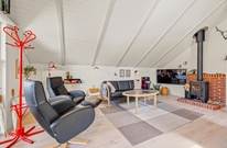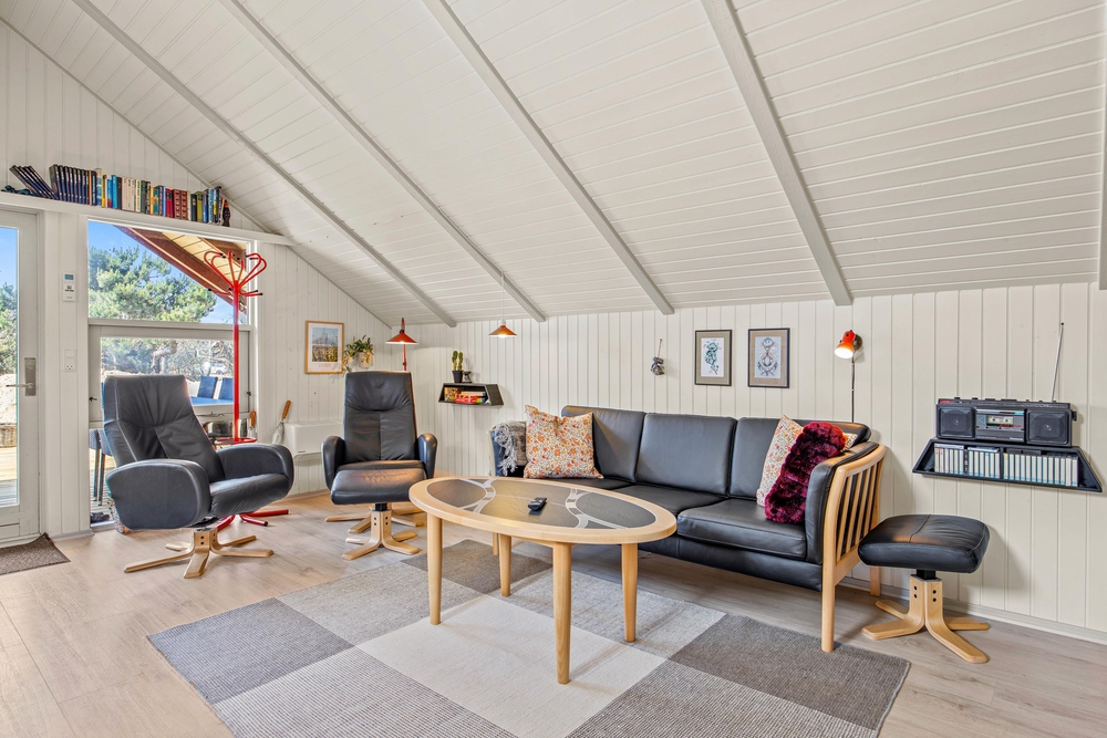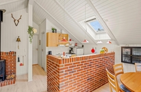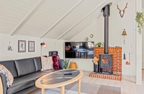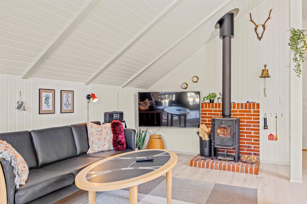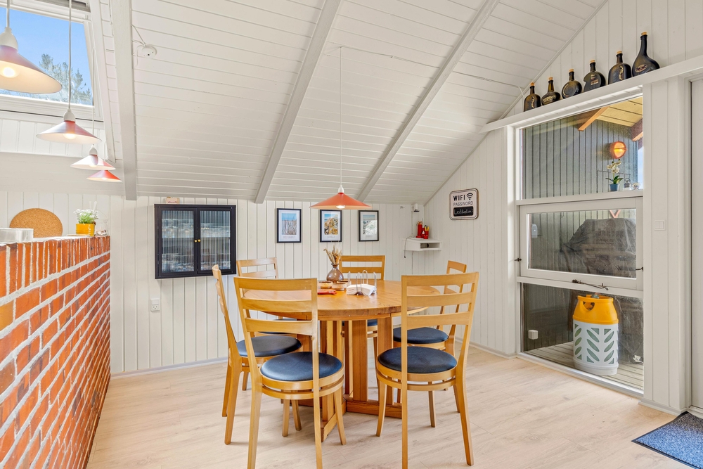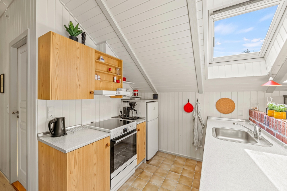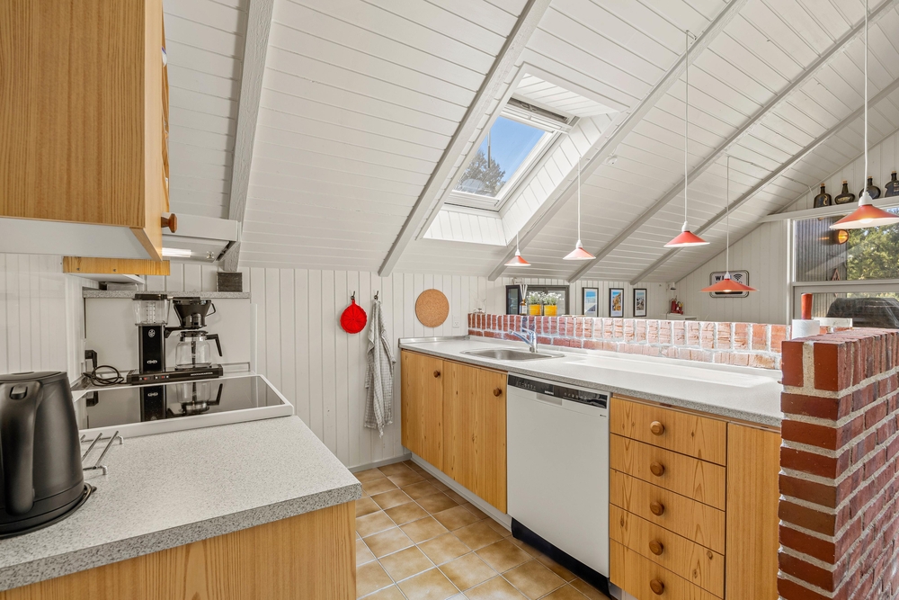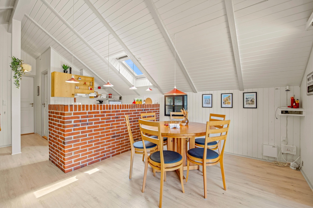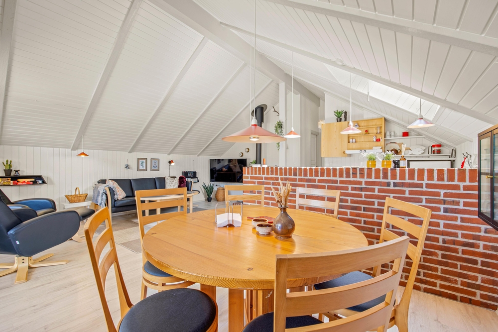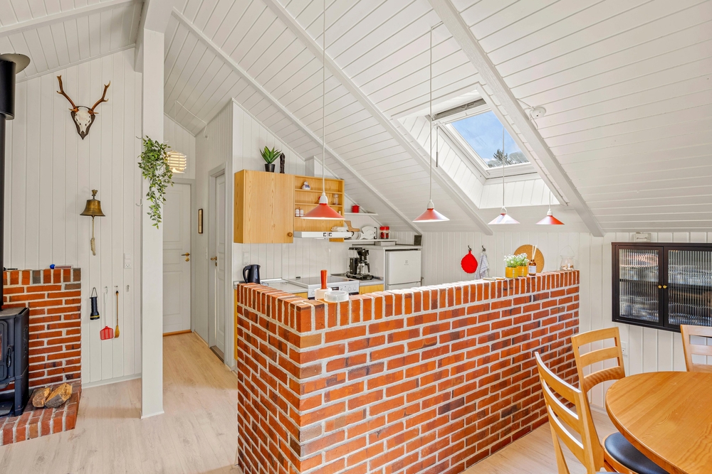 Der offene Wohnbereich mit dem Charme der niedrigen Dachschrägen, laden euch zu ?hyggeligen? Stunden ein. Der Ausblick auf Kiefern, Heide und Gräser sind Balsam für die Seele. In der offenen Küche habt ihr alles was ihr braucht um es euch kulinarisch in eurem Urlaub so richtig gute gehen zu lassen. Am Esstisch wird dann nicht nur gemeinsam gegessen, sondern hier könnt ihr anschließend auch noch zu einem gemeinsamen Spieleabend zusammenkommen. Die Gemütlichkeit kann dann nur noch durch ein loderndes Feuer im Kaminofen getoppt werden.