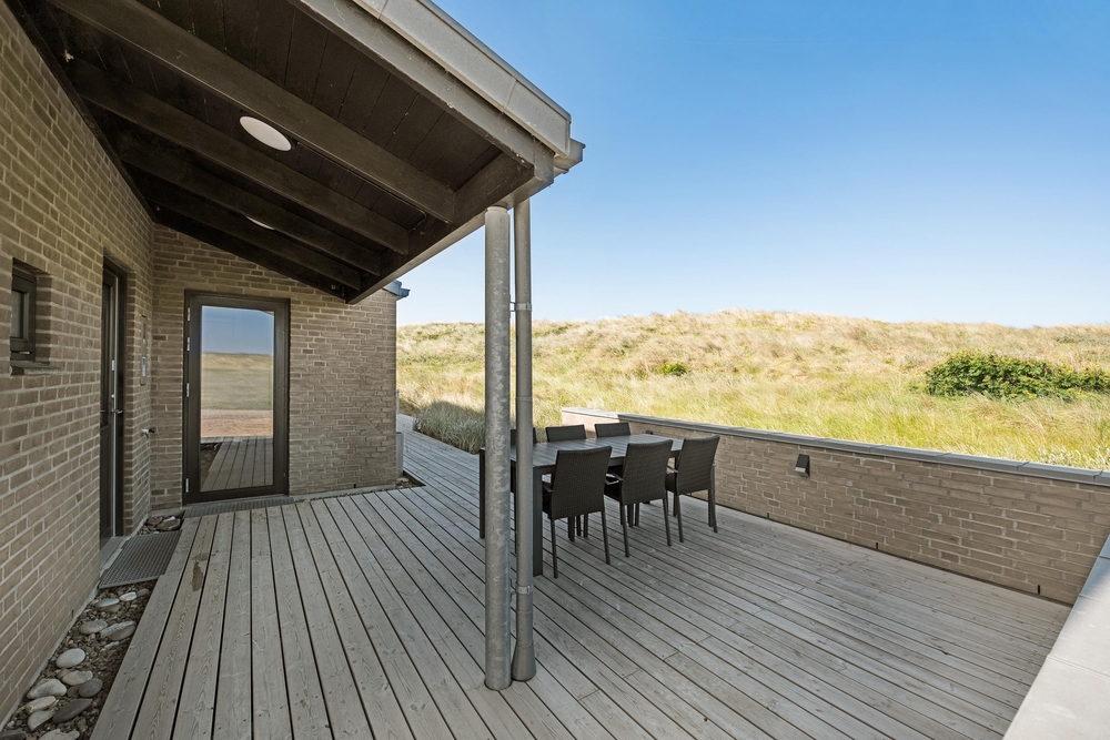 Das hügelige Naturgrundstück sorgt für guten Schutz vor dem Westwind, ebenso für Privatsphäre beim Sonnenbaden auf der Terrasse. Das Meer hört ihr deutlich auf der Terrasse und es dauert nur 5 Minuten zu Fuß bis an den Strand. Das Gebiet Houvig ist für seine großen und hügeligen Grundstücke bekannt und dieses Haus ist ein typisches Beispiel. Der naheliegende Weg stört überhaupt nicht, da das Haus durch einen Wall abgeschirmt ist und über lärmisolierende Fenster verfügt.