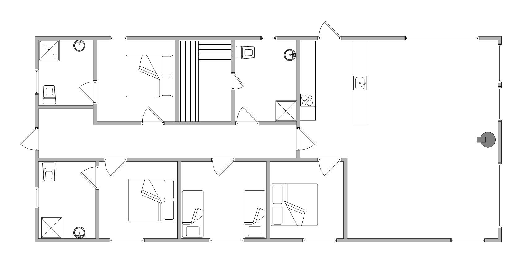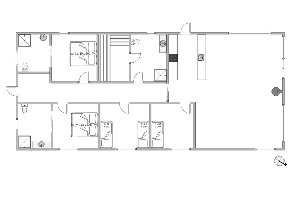 Im vorderen Teil des Hauses findet ihr dann die 4 Schlafräume und die 3 Badezimmer. Es ist also reichlich Platz für bis zu 7 Personen vorhanden.