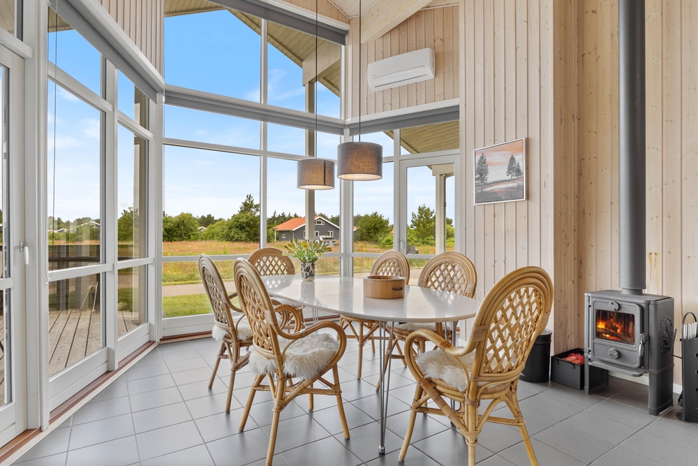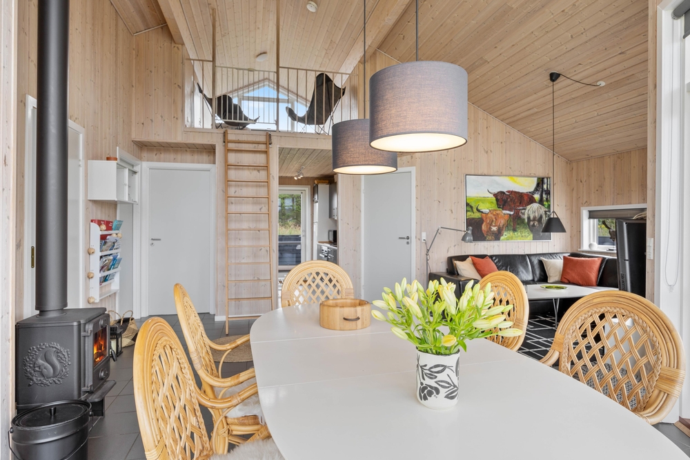 Die Ausstattung des Hauses auf Fjand Strand 52 lässt keine Wünsche offen. Im gemütlich ausgestattetem Wohnzimmer, welches mit der Küche und dem Essbereich verbunden ist, darf ein Kamin natürlich nicht fehlen. Ob ihr nun ein knisterndes Feuerchen im Kamin oder alternativ die energiesparende Wärmepumpe nutzt, um es gemütlich warm zu haben, entscheidet ihr. An ganz stürmischen Tagen ist so ein Kamin manchmal etwas unkooperativ ? dann nehmt ihr einfach die Wärmepumpe.