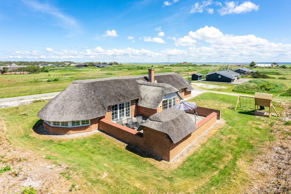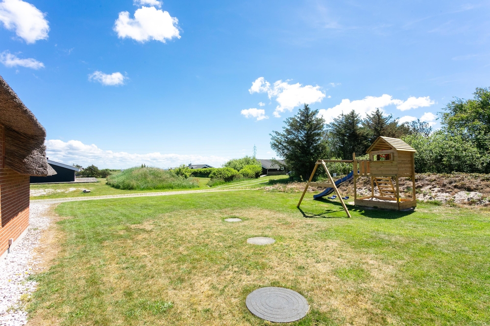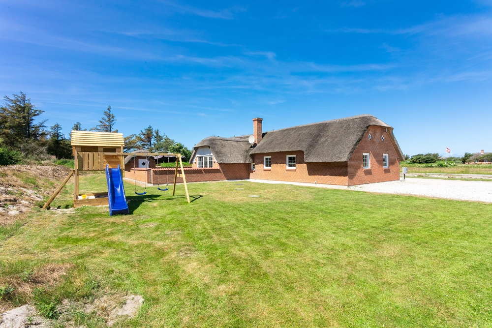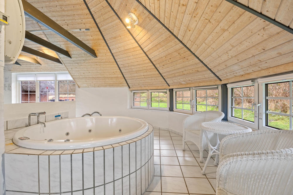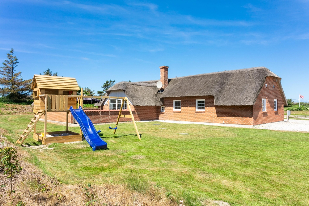 Ein Ferienhaus mit Platz für die aktive Großfamilie. Mit tollem 18 m2 großen Pool mit Gegenstromanlage, Whirlpool, Sauna und Badezimmer im Poolbereich. Südlich vom Ferienhaus gibt es eine geschlossene Terrasse und auf dem Rasen seitlich daneben einen kleinen Spielplatz für die Kinder.