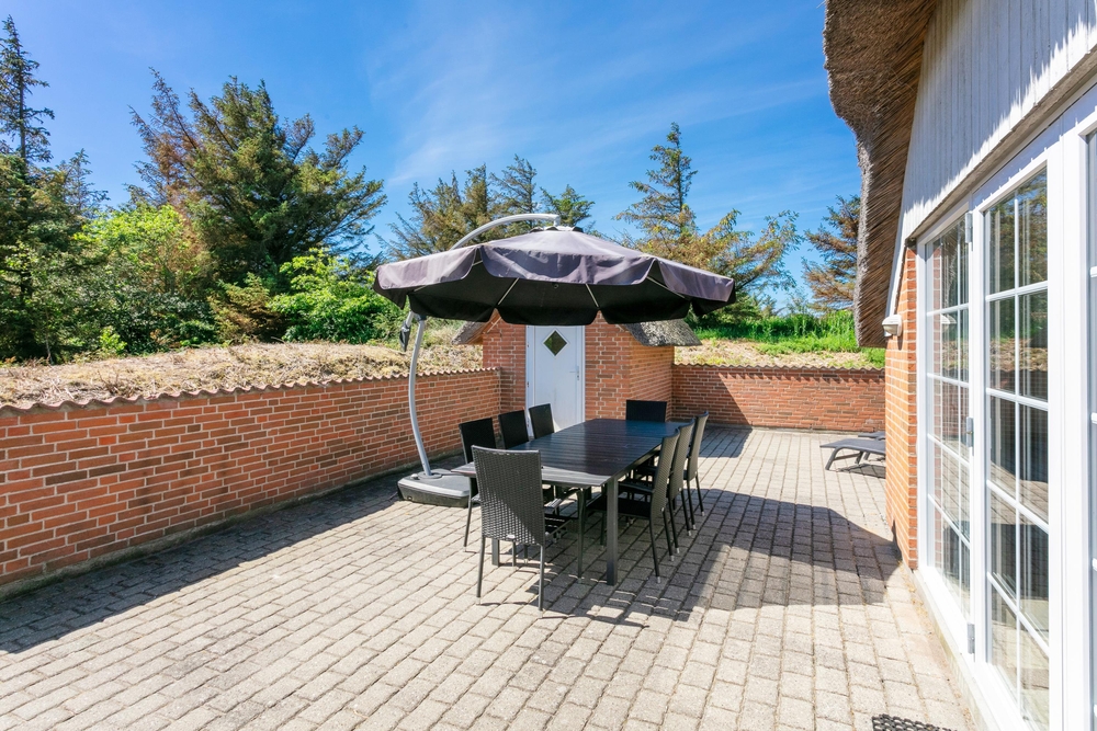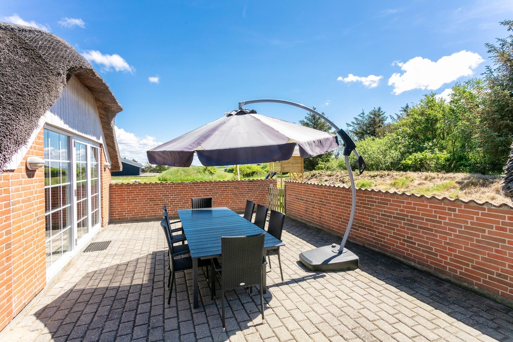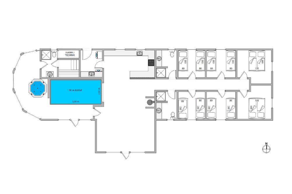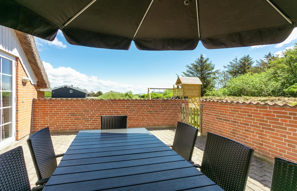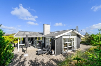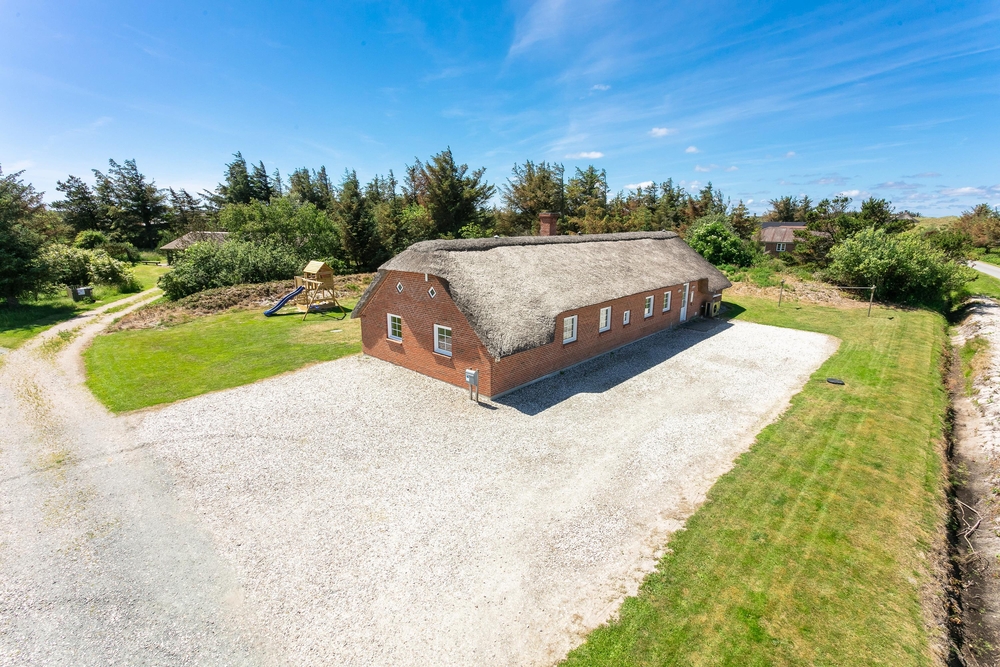 Ein Ferienhaus mit Platz für die aktive Großfamilie. Mit tollem 18 m2 großen Pool mit Gegenstromanlage, Whirlpool, Sauna und Badezimmer im Poolbereich. Südlich vom Ferienhaus gibt es eine geschlossene Terrasse und auf dem Rasen seitlich daneben einen kleinen Spielplatz für die Kinder.