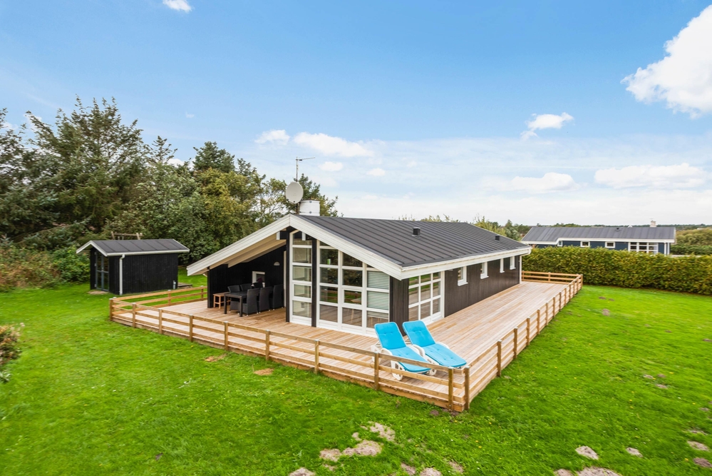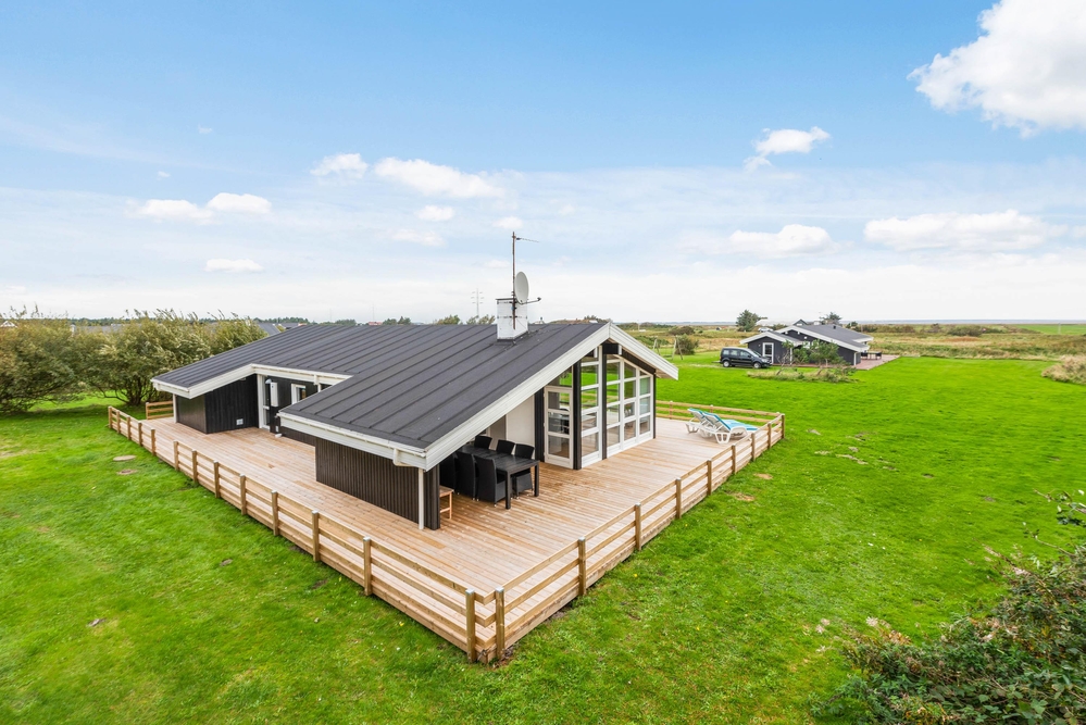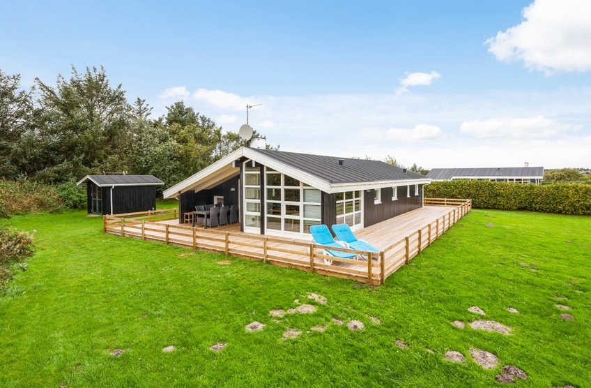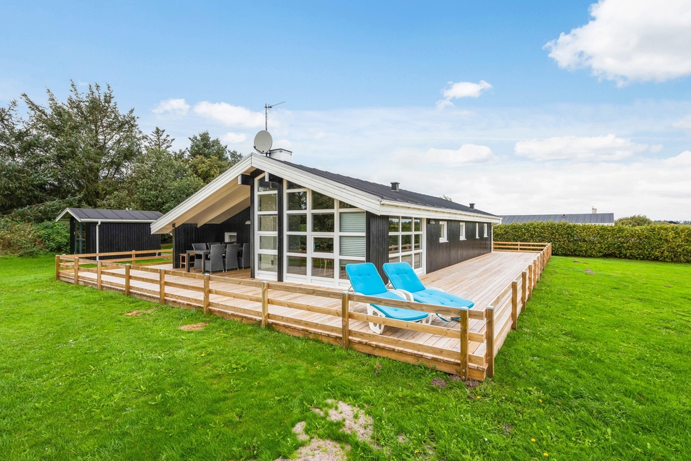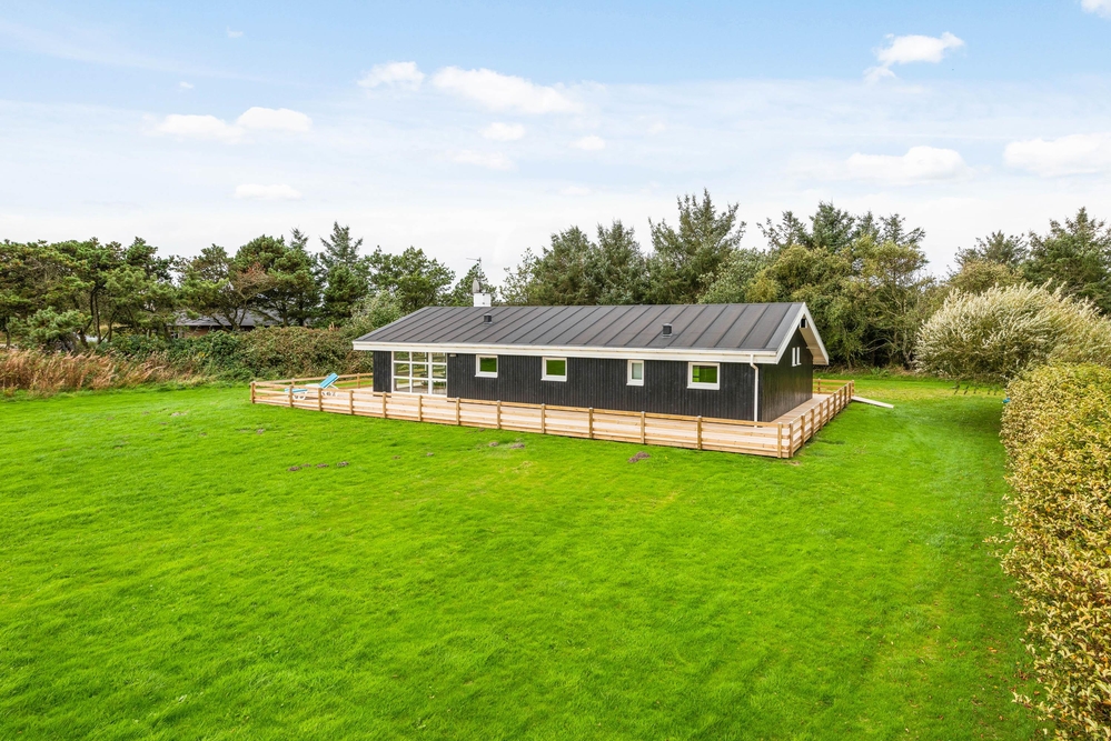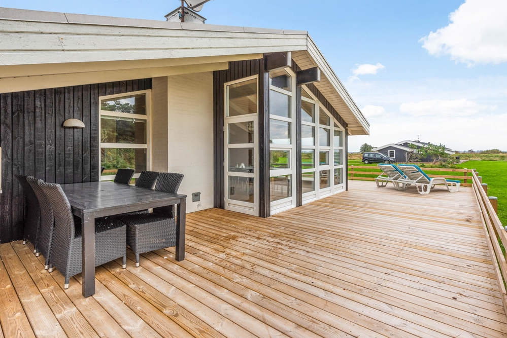 Das Ferienhaus ist von einer großzügigen Terrasse umgeben, von der Ihr die Kinder oder Hunde beim spielen auf dem Rasengrundstück im Auge behalten könnt.