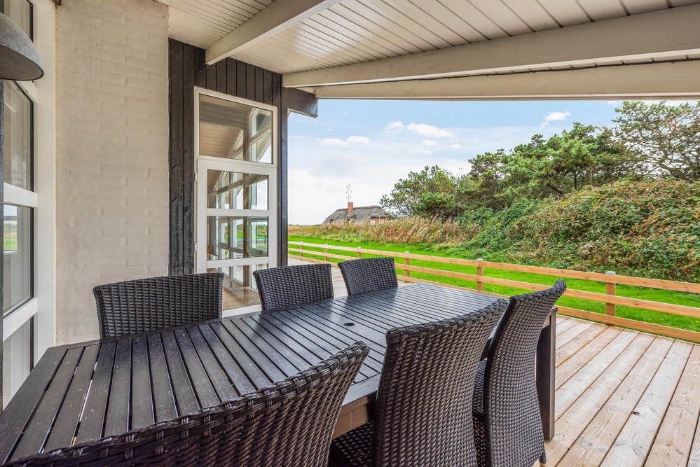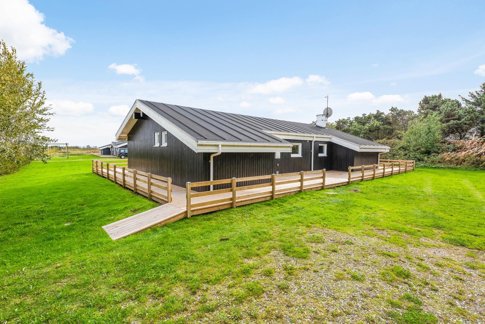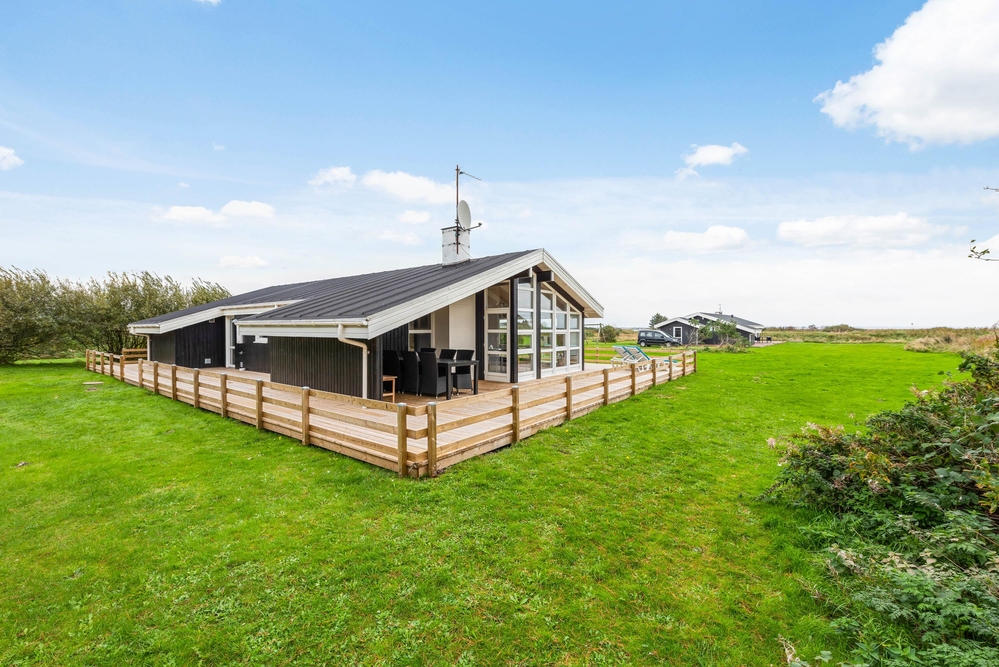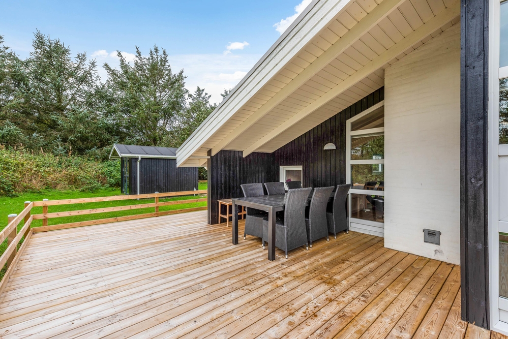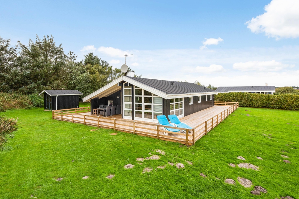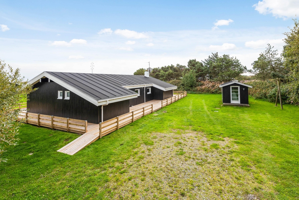 Das Ferienhaus ist von einer großzügigen Terrasse umgeben, von der Ihr die Kinder oder Hunde beim spielen auf dem Rasengrundstück im Auge behalten könnt.