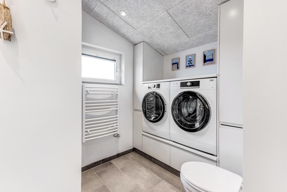 Von der Terrasse aus habt ihr Zugang zu einem Schuppen, in dem ihr Fahrräder aufbewahren könnt, wenn ihr welche mit in den Urlaub nehmt. Der Schuppen ist auch mit einem kleinen Hauswirtschaftsraum ausgestattet, in dem sich auch die Gefriertruhe des Ferienhauses befindet.
