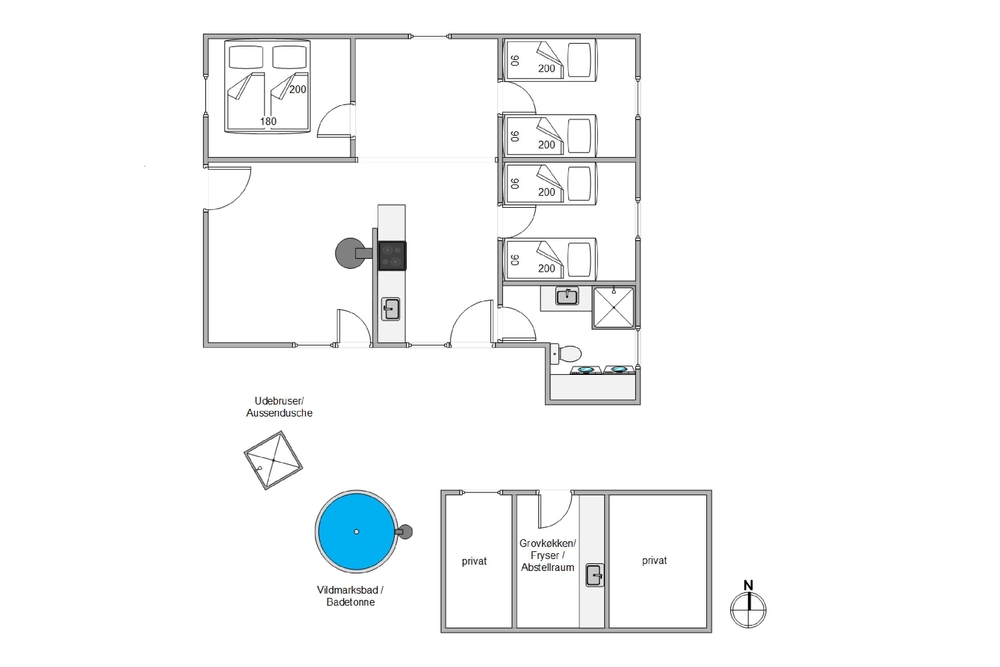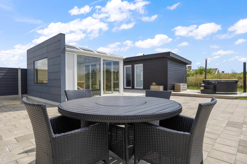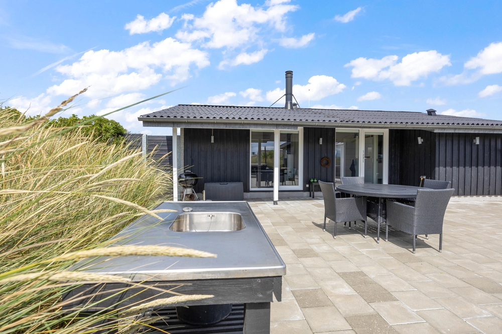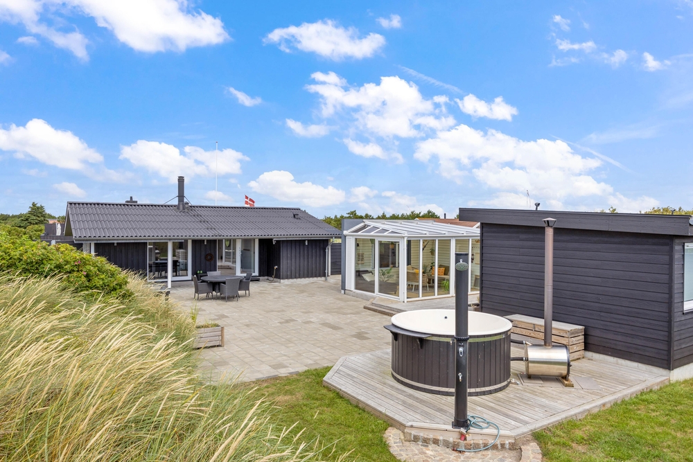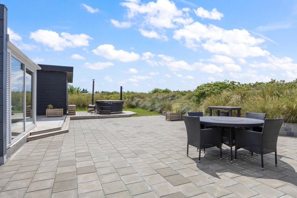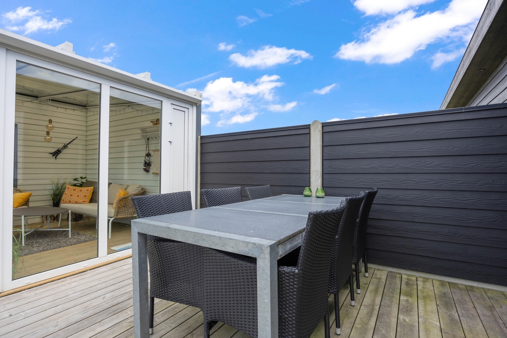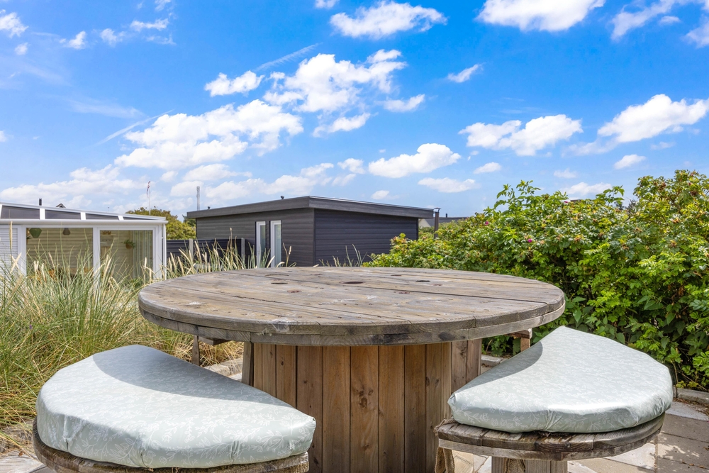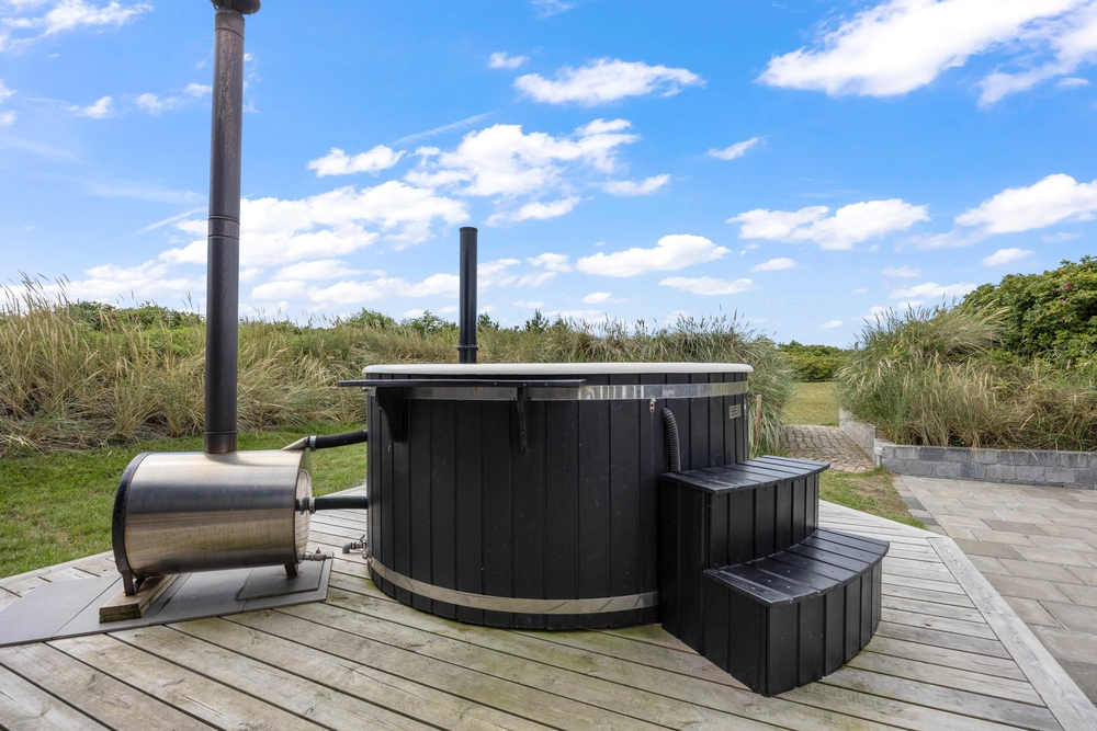 Das Highlight des Ferienhauses ist die tolle, abgeschirmte Terrasse. Hier findet ihr nicht nur passende Gartenmöbel, Sonnenliegen und einen Grill, sondern auch eine große Badetonne, welche euren Urlaub mit den schönsten Wellnesserlebnissen unter freiem Himmel bereichert. Nach einem entspannten Moment in der Badetonne könnt ihr eure Füße unter der Außendusche abspülen, was auch sehr praktisch ist, wenn ihr von einem Strandausflug mit sandigen Füßen nach Hause kommen.