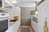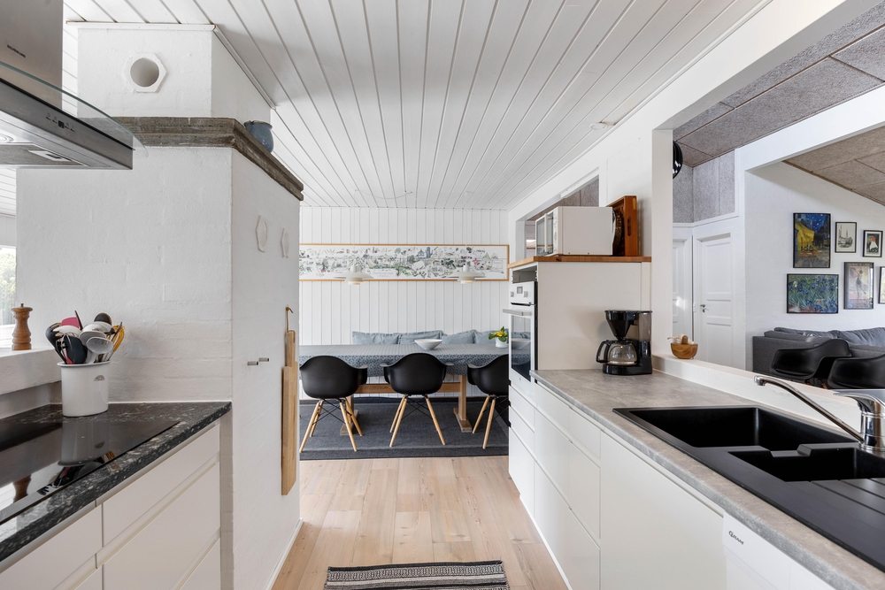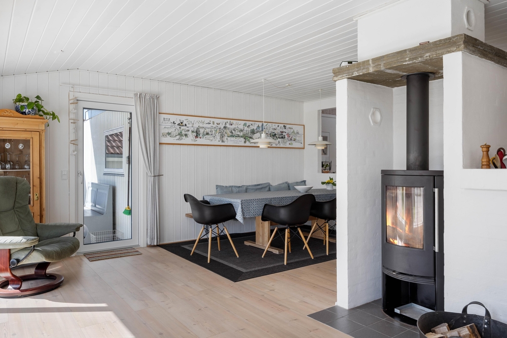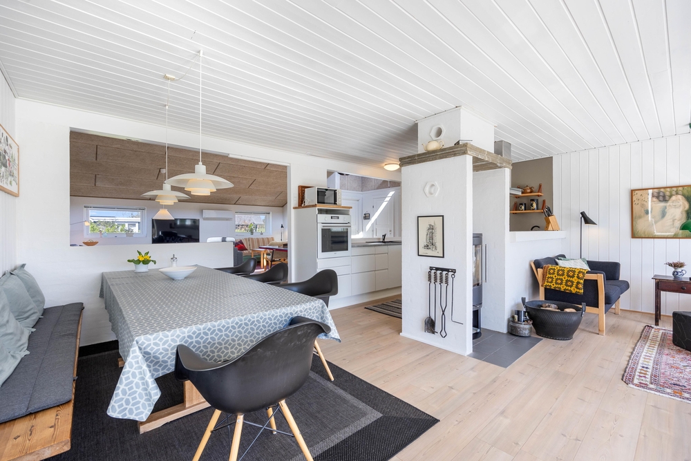 Wenn ihr das Ferienhaus betretet, gelangt ihr über einen kleinen Flur in den großen Wohnraum mit integrierter Küche und Essbereich. Der große Wohnraum ist das Herzstück des Ferienhauses und bietet euch genügend Platz gemeinsam Spiele zu spielen, zu kochen oder die nächsten Urlaubsaktivitäten zu planen. An regnerischen Tagen könnt ihr den Tischtennismeister des Urlaubs küren, während die anderen es sich vor dem Holzofen gemütlich machen.