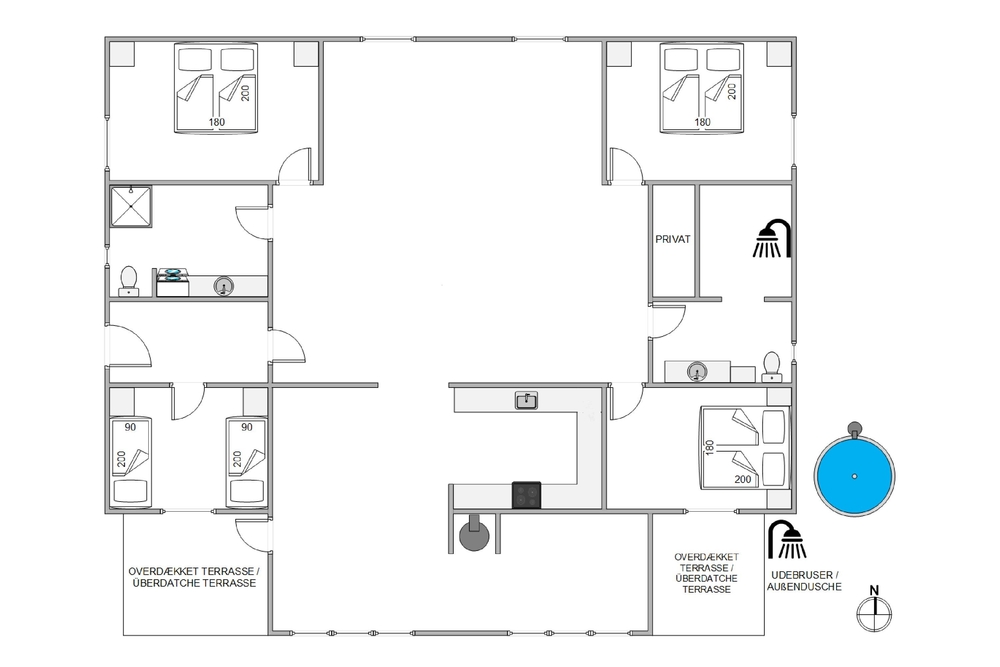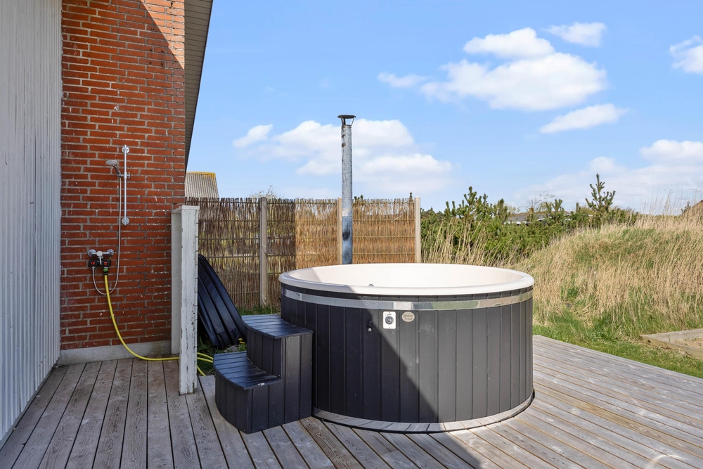 Vom Ferienhaus aus sind es ca. 1200 Meter bis zum kilometerlangen Sandstrand der dänischen Westküste. Hier könnt ihr herrlich lange Spaziergänge machen, die auch eure Hunde lieben werden, Sandburgen bauen oder dem Rauschen der Nordsee lauschen. Ein Besuch am Strand ist zu jeder Jahreszeit ein tolles Erlebnis. Wenn ihr dann wieder am Ferienhaus seid, könnt ihr euch mit der Außendusche von April-November den Sand von den Füßen spülen, bevor ihr reingeht.
