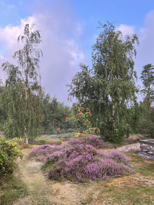 Das Ferienhaus im Foidal 1 ist auf einem großen Naturgrundstück, das von Bäumen umgeben ist, gelegen. Von der großen Terrasse aus kann kam die Aussicht auf die schöne Heide- und Waldlandschaft genießen. Besonders im Spätsommer, wenn die Heide in lila und purpurroten Farben blüht, ist dies eine wunderschöne Aussicht. Hier kommen auch regelmäßig Rehe, Hasen und Fasane vorbei.