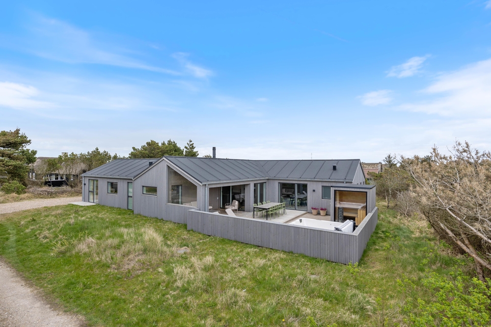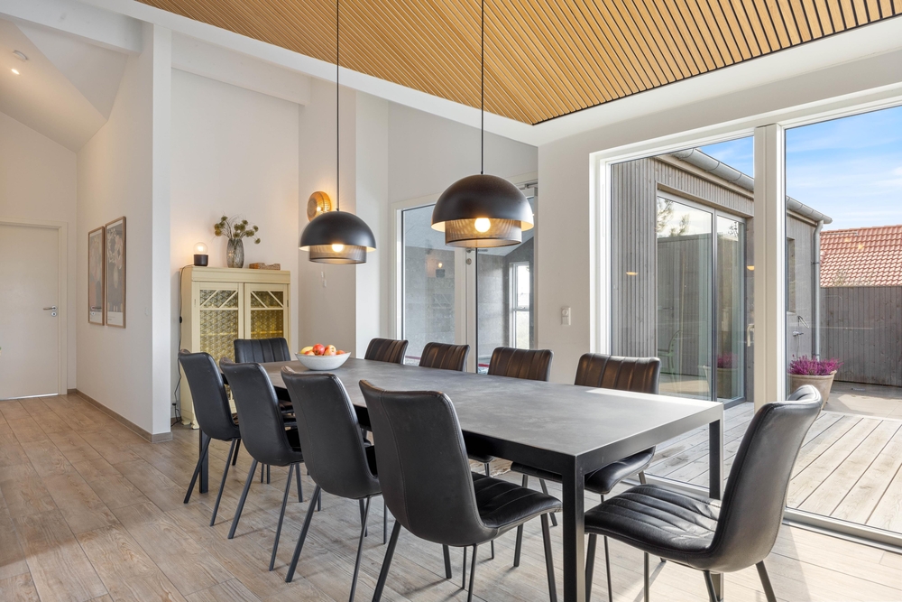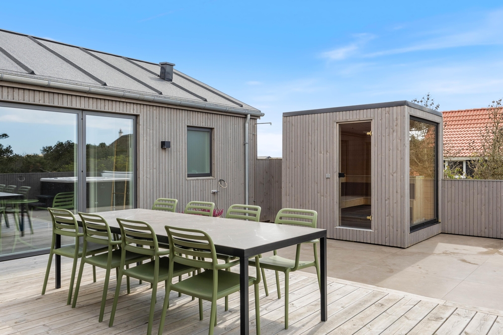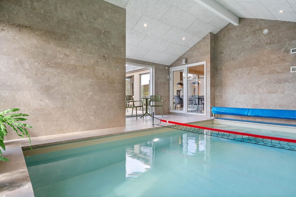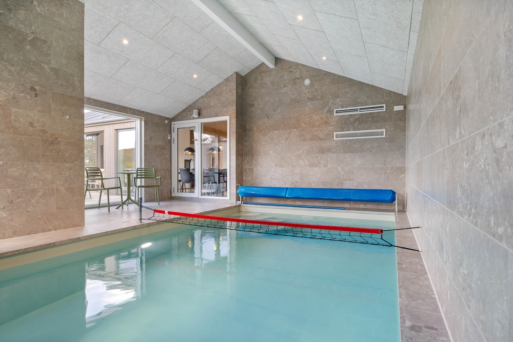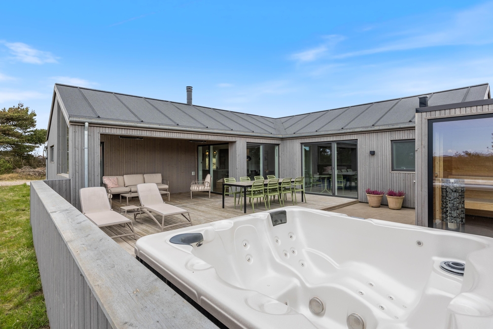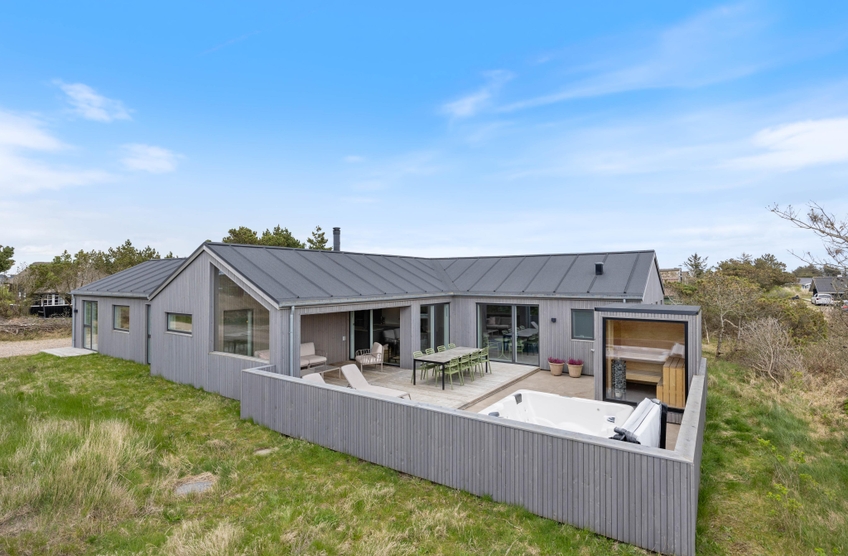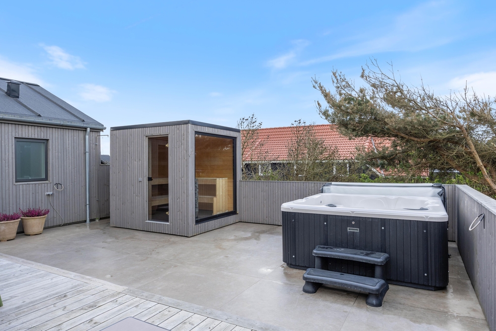 Dieses stilvolle und moderne Ferienhaus in Fyrmarken 155 in Nørre Lyngvig bietet auf 180 m² viel Platz für den nächsten Familienurlaub oder für Freunde, die einfach mal Lust haben, die Seele baumeln zu lassen. Dieses Ferienhaus lässt keine Wünsche offen und bietet euch den perfekten Rahmen für euren Urlaub an der dänischen Westküste. Im Innenbereich gibt es so viele Dinge zu entdecken ? es gibt einen Salzwasserpool, einen Aktivitätsraum und ein großes, harmonisches Familienzimmer. Der schöne Außenbereich überzeugt mit gemütlicher Loungeecke, Außenwhirlpool und Außensauna.