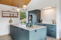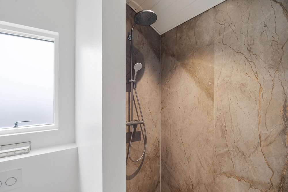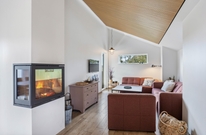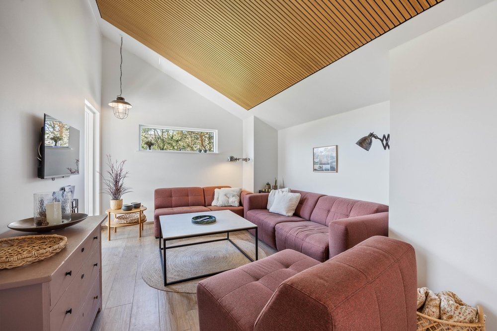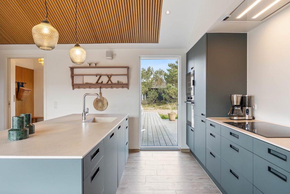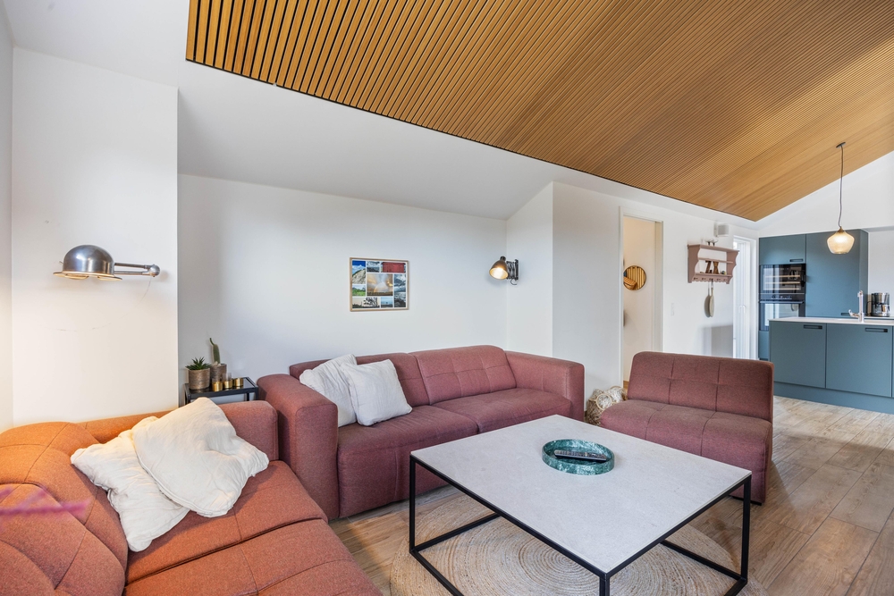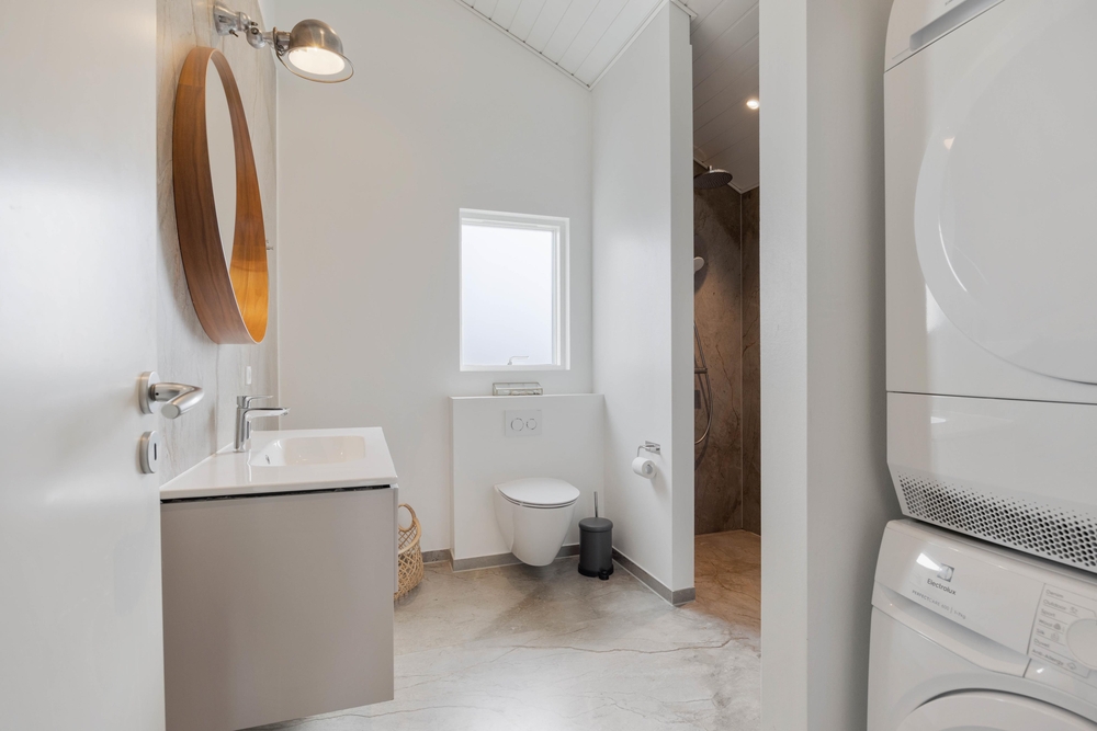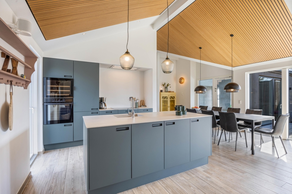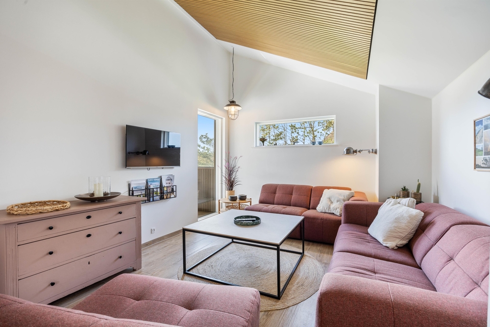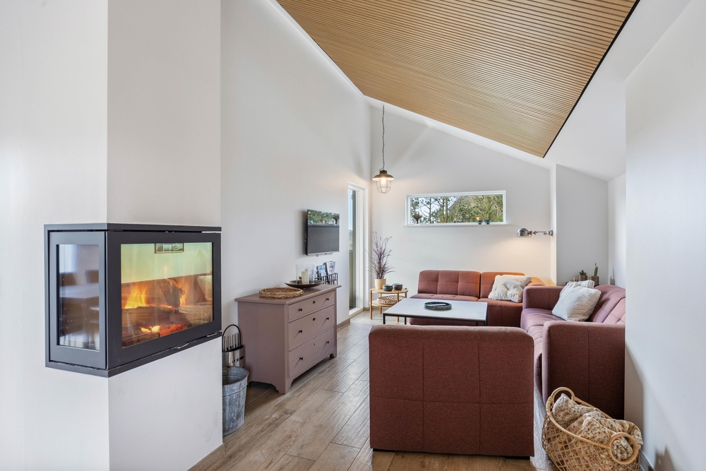 Das Haus ist durchweg hell, mit pflegeleichten Fliesenböden und Fußbodenheizung, großen Fenstern und bequemen Möbeln in Erdtönen ausgestattet. Der Familientreffpunkt ist der offene Wohnbereich, wo Wohnzimmer, Essbereich und Küche sich in einem Raum befinden. Sowohl am Esstisch als auch von der Eckcouch aus könnt ihr den knisternden Holzofen in der Mitte des Raumes genießen.
