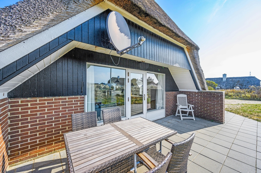 Vom Wohnraum aus gelangt ihr auf die große, teilweise überdachte Terrasse des Ferienhauses ? der perfekte Ort, um an den warmen und sonnigen Tagen des Urlaubs zu entspannen. Die Terrasse ist nach Süden ausgerichtet und euch stehen sowohl Gartenmöbel als auch Sonnenliegen zur Verfügung, sodass ihr euch hier wohlfühlen und den Urlaub in vollen Zügen genießen könnt.