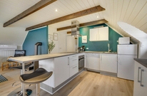 Das Herz und der Treffpunkt des Hauses ist der Wohnbereich, in dem Küche und Wohnzimmer vereint sind. Die Küche ist gut ausgestattet und bietet viel Platz für Hobbyköche, um köstliche Speisen zu zaubern. Der Geschirrspüler kümmert sich um das Geschirr, sodass ihr mehr Zeit füreinander habt.