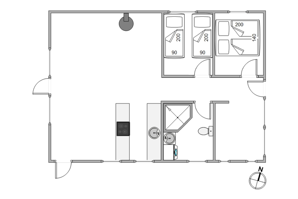 Im Inneren des Hauses stellt der Aufenthaltsraum aus Wohnzimmer mit Essbereich und Küche das Herzstück dar. Hier lassen sich nicht nur entspannte Abende auf dem Sofa verbringen, sondern man kann auch in der kleinen, aber feinen Küche gemeinsam kochen. Die Spülmaschine erledigt danach den lästigen Abwasch, damit ihr mehr Zeit füreinder habt. Durch die großen Fenster scheint besonders viel Licht rein und man fühlt sich wie draussen in der Natur. Wenn es draussen kühler wird, macht den Holzofen an und sorgt für noch mehr Ferienhausatmospähre.