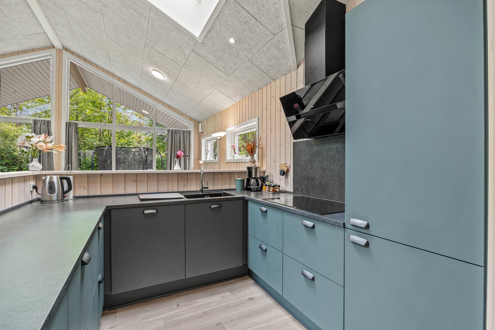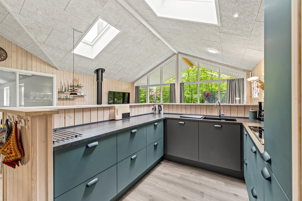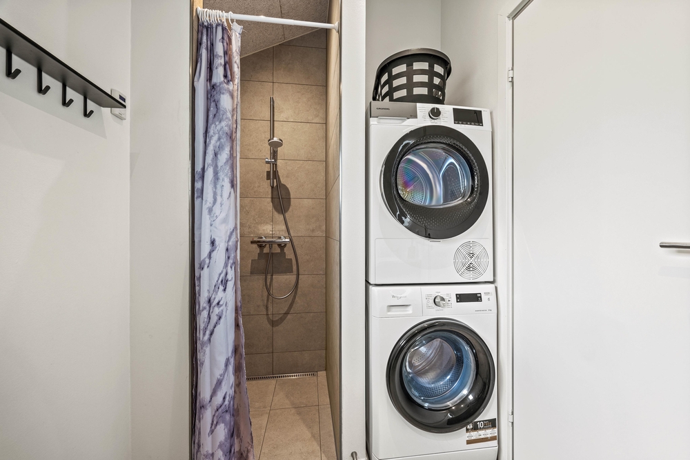 Die in den Wohnraum integrierte Küche lässt mit ihrer modernen Ausstattung, inklusive Spülmaschine, keine Wünsche offen. Ebenfalls vorhanden sind eine Waschmaschine und ein Trockner, sodass auch längere Aufenthalte problemlos möglich sind. Für euer Elektroauto steht natürlich ein Ladeanschluss zur Verfügung.