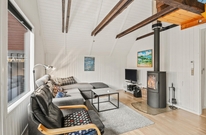 Das Wohnzimmer des Ferienhauses strahlt mit seinem gemütlichen Kaminofen eine einladende Atmosphäre aus, die an kälteren Tagen besonders geschätzt wird. Die offene Gestaltung sorgt für ein harmonisches Wohnambiente, das Erholung und Entspannung in den Mittelpunkt stellt und der perfekten Ort zum Entspannen, Lesen oder für gemeinsame Abende mit der Familie oder Freunden ist.