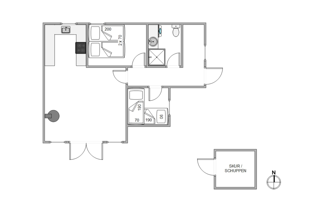 Das Ferienhaus verfügt über 2 Schlafzimmer. Eines ist mit 1 Doppelbett ausgestattet während das 2.Schlafzimmer über ein Etagenbett verfügt. Ideal für Kinder oder zusätzliche Gäste.
