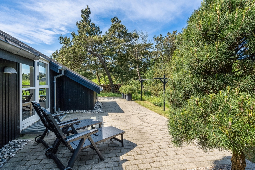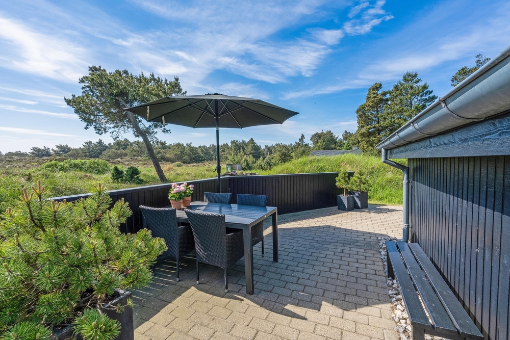 Das Ferienhaus in Henne Strand mit wunderschöner und ruhiger Lage auf Fyrrenålevej 1, bietet einen schönen Blick auf ein riesiges Heidegebiet auf der gegenüberliegenden Straßenseite, was gerade im Spätsommer ein Traum in Rosa und Lila ist. Direkt vom Frühstückstisch könnt ihr diesen fantastischen Ausblick genießen, während ihr die Aktivitäten des Tages plant.