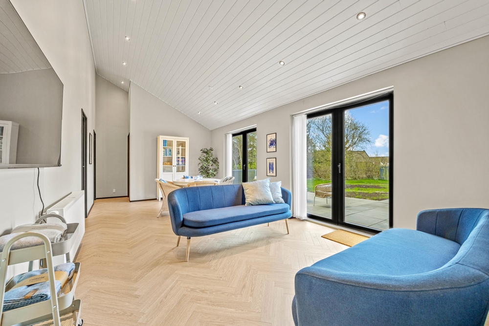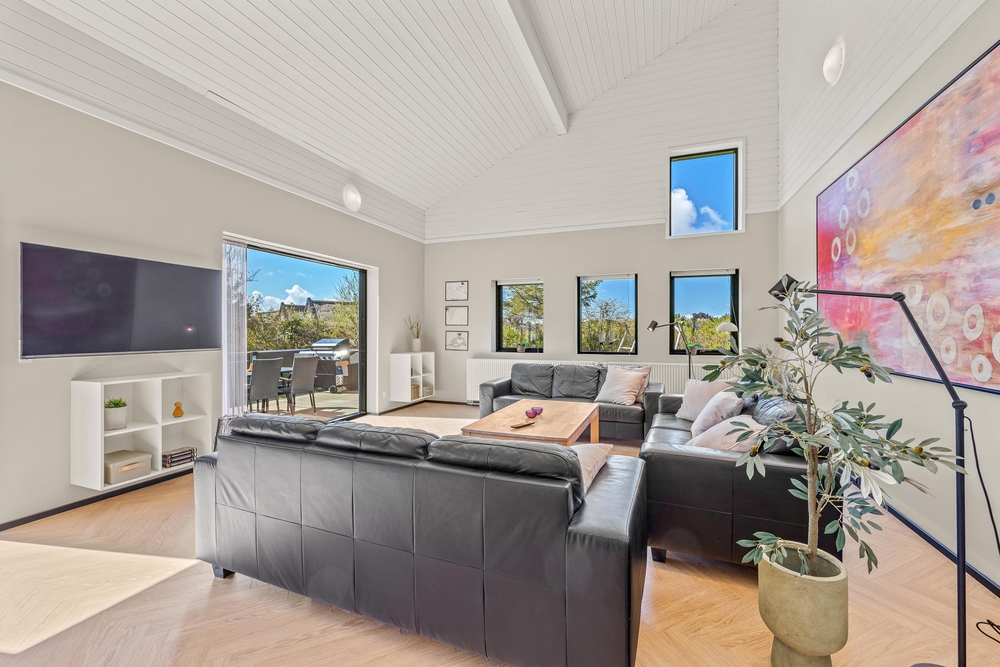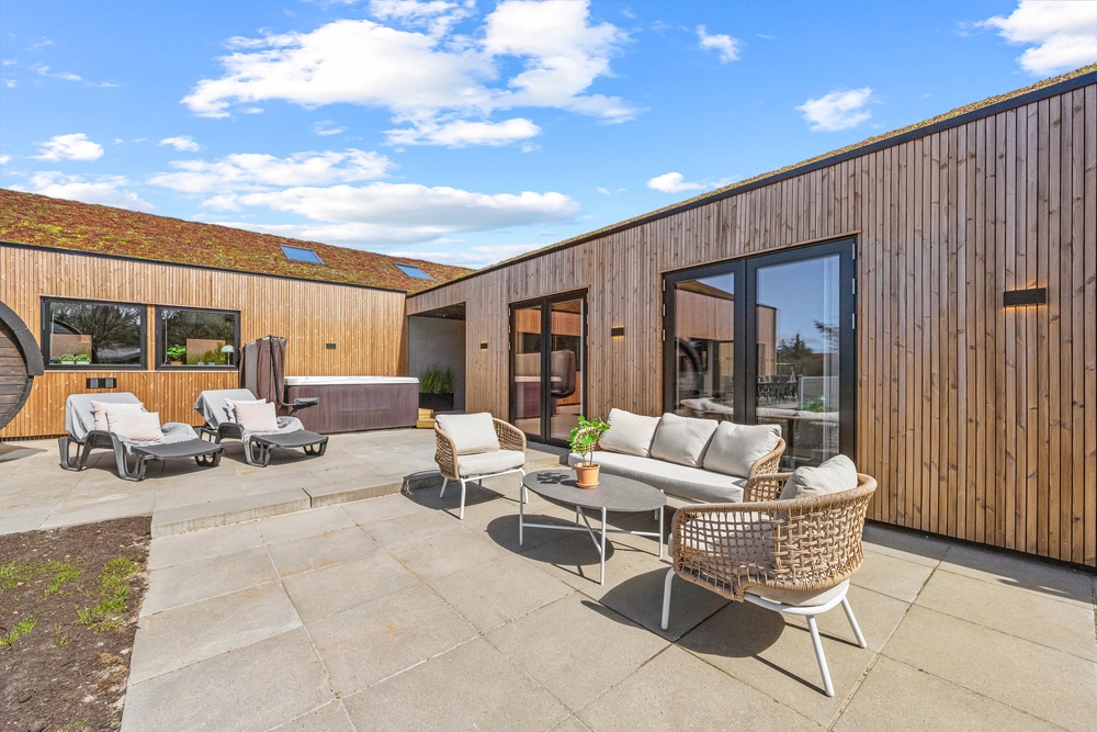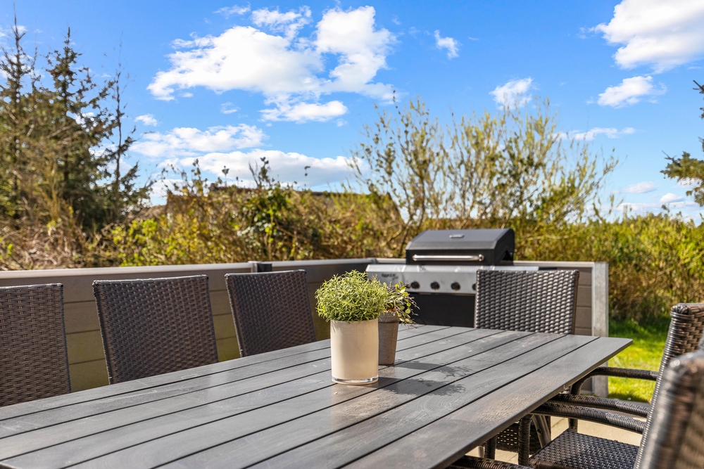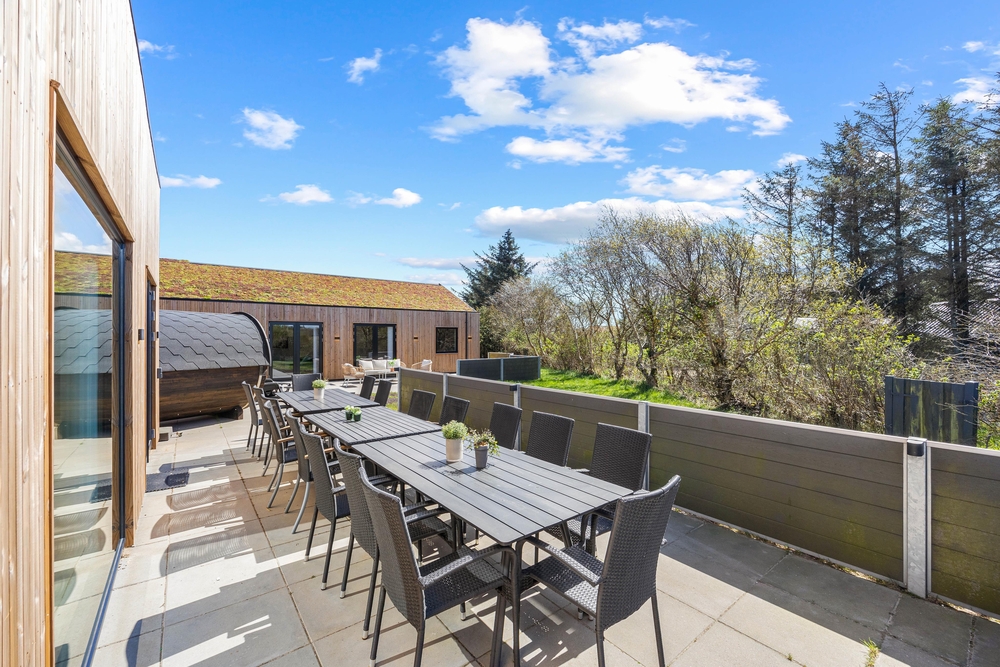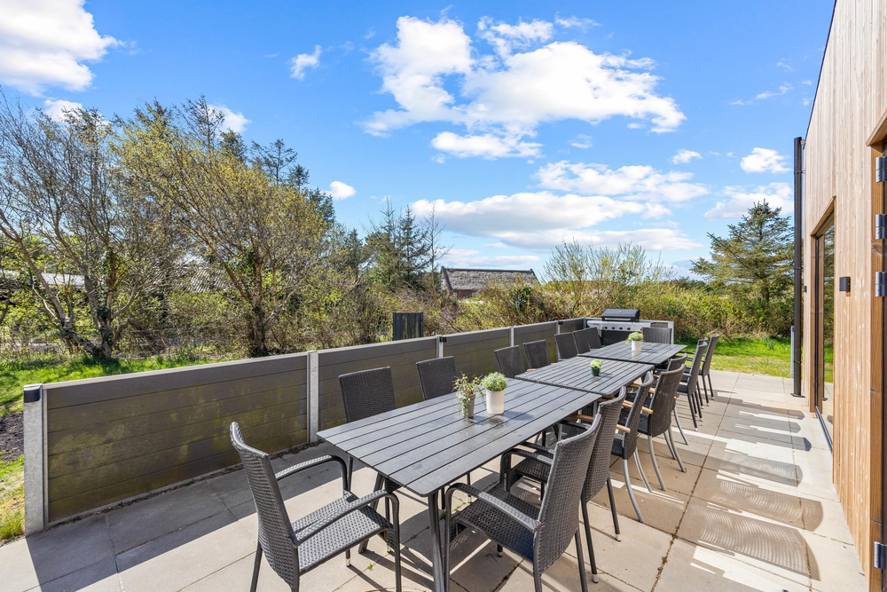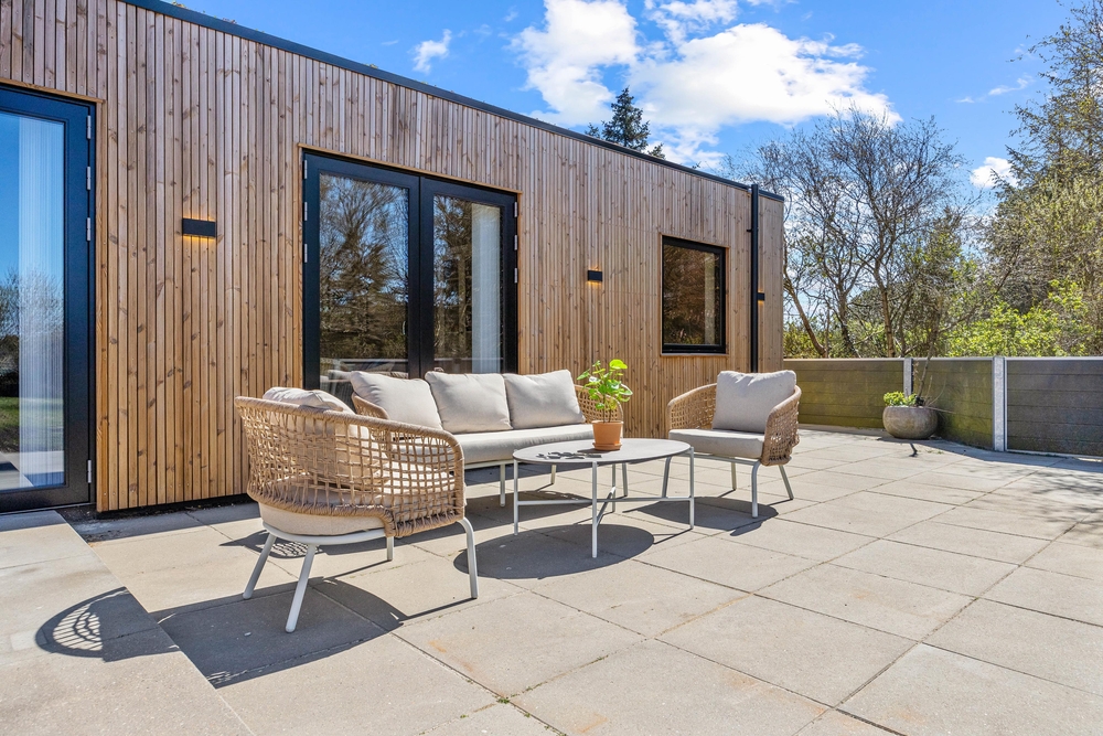 Rund um dieses schöne Ferienhaus ist eine große Terrasse angelegt. Somit ist ein sonniges Plätzchen zum Energie tanken immer gesichert. Liegestühle und Gartenmöbel stehen für gemeinsame Grillstunden, oder einer Kaffeepause mit leckerem dänischen Kuchen am Ferienhaus bereit.