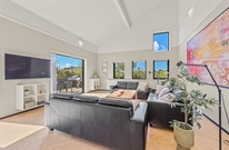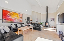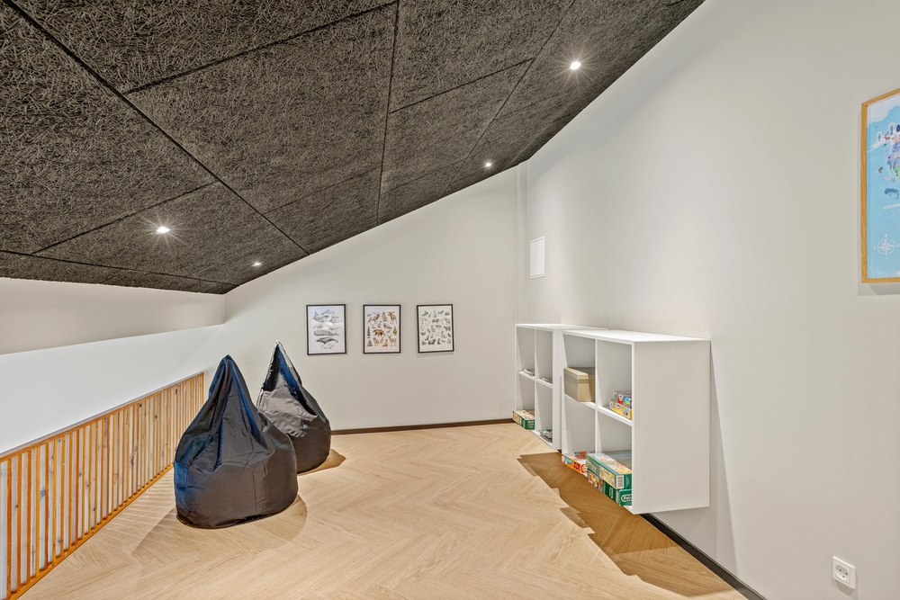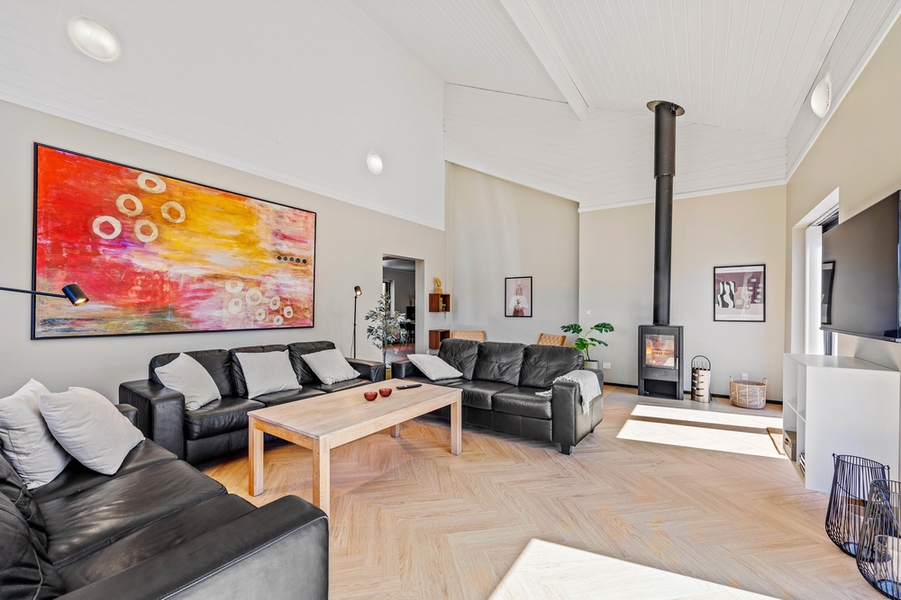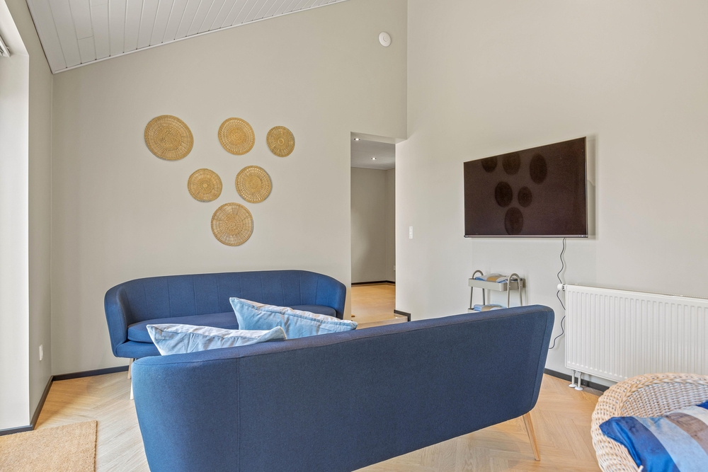 Auf den insgesamt 313 m² ist ausreichend Platz für bis zu 14 Personen. Durch den besonderen Grundriss, gibt es genügend Rückzugs Möglichkeiten, falls man sich dem Trubel auch mal entziehen möchte. Im großen Wohnbereich können alle für einen gemütlichen Filmeabend, mit einem lodernden Feuer im Kaminofen zusammenkommen. Es gibt aber auch noch ein kleineres Wohnzimmer mit TV.