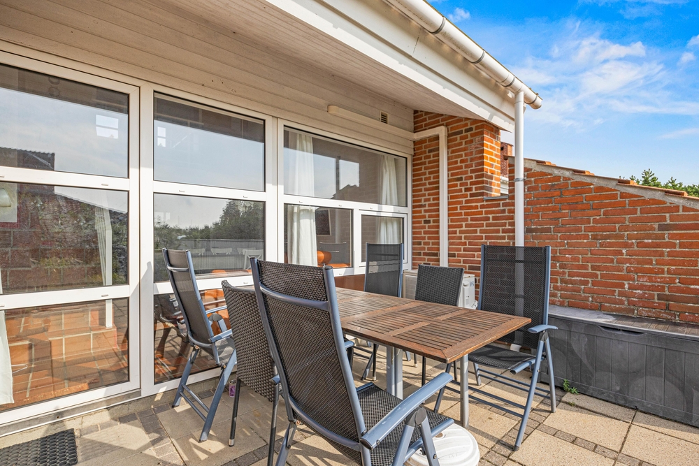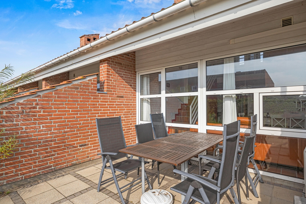 Die offene Terrasse erreicht ihr direkt vom Wohnzimmer aus. Hier könnt ihr morgens euren Kaffee trinken und am Abend gemeinsam ein Abendessen an der frischen Meeresluft genießen. Eure Kinder können auf dem kleinen Spielplatz der Ferienanlage spielen und sich austoben.