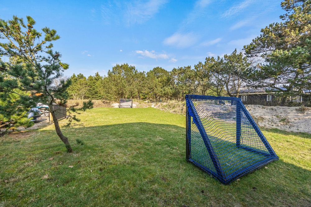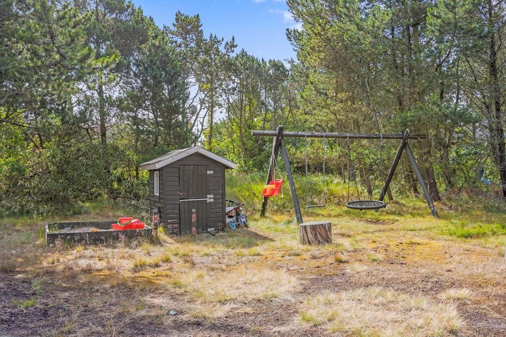 Das Ferienhaus liegt auf einem Naturgrund, der durch hohe Bäume gut abgeschirmt ist. Eine Schaukel und ein Sandkasten werden Kinderherzen erfreuen.