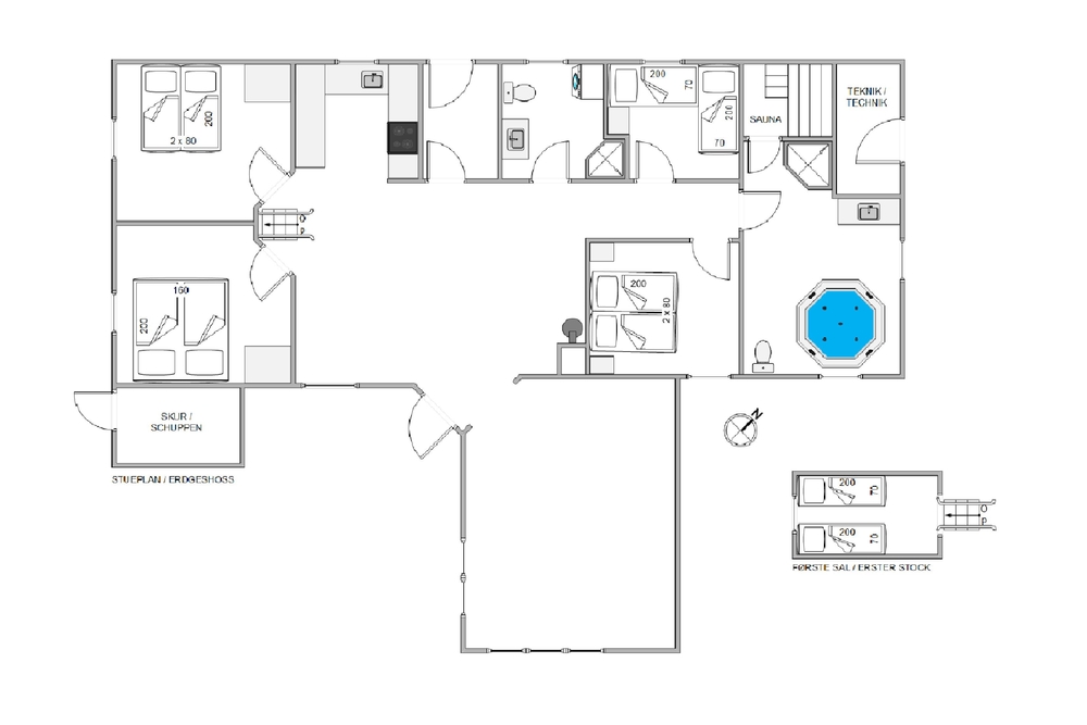 Auf den insgesamt 143 m² gibt es 4 Schlafzimmer. 3 davon mit Doppelbetten und eins mit 2 Einzelbetten. 2 weitere Schlafplätze gibt es auf dem offenen Dachboden. Da finden die Kids es bestimmt besonders gemütlich. Es gibt zwei Badezimmer, beide mit Fußbodenheizung. Morgens muss hier keiner Schlange stehen.