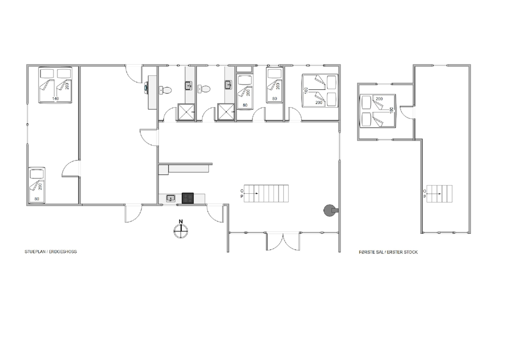 Das Ferienhaus hat insgesamt 4 Schlafzimmer. Eins davon befindet sich im Obergeschoss, alle anderen sind im Erdgeschoss, genauso wie die beiden Badezimmer. Die Bäder sind beide voll ausgestattet mit Fußbodenheizung und einer Duschnische. So kann sich jeder in seinem eigenen Bad einrichten. Wenn man mit mehreren zusammen Urlaub macht ist das sehr praktisch.