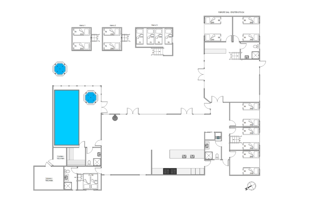 Das große Poolhaus in Blåvand verfügt über insgesamt 250 Quadratmeter Wohnfläche, wo es ausreichend Platz für bis zu 20 Personen gibt. Insgesamt stehen 4 Badezimmer zur Verfügung.