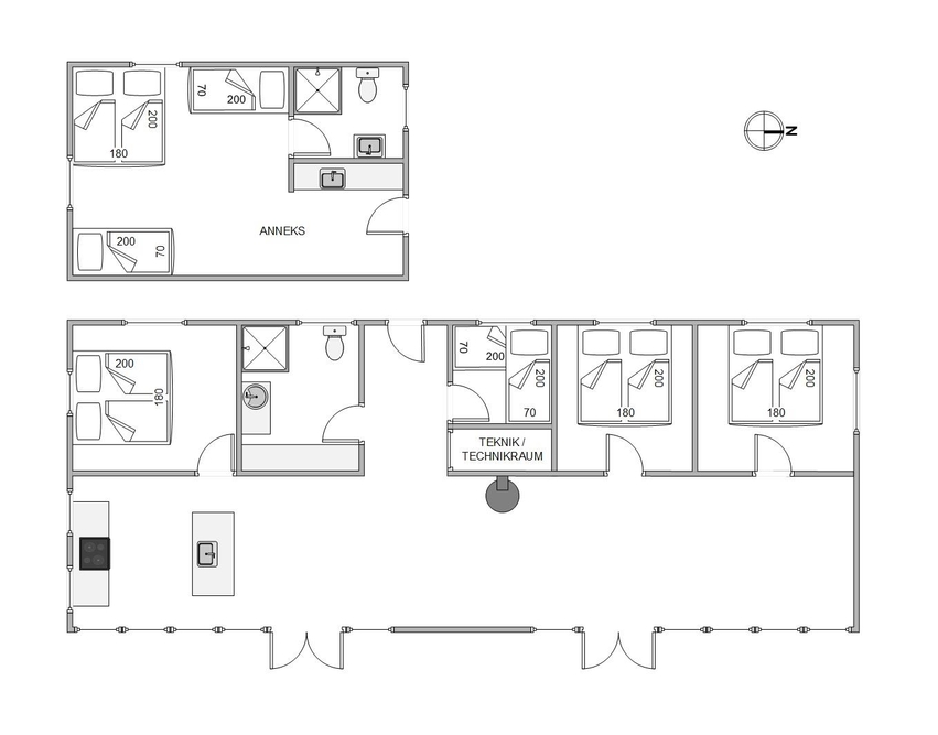 Sowohl das Badezimmer im Haupthaus als auch das Bad im Anbau verfügen über eine Dusche. Hier muss also niemand Schlange stehen. Praktischerweise stehen euch auch eine Waschmaschine und ein Trockner zur Verfügung. Im Haupthaus befinden sich 4 Schlafzimmer. In dreien davon gibt es gemütliche Doppelbetten und im vierten ein Einzelbett und ein Hochbett. Im Anbau findet ihr 2 Einzelbetten und ein Doppelbett.