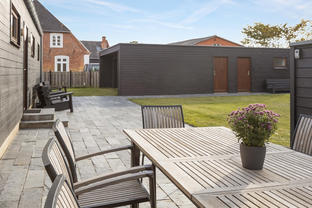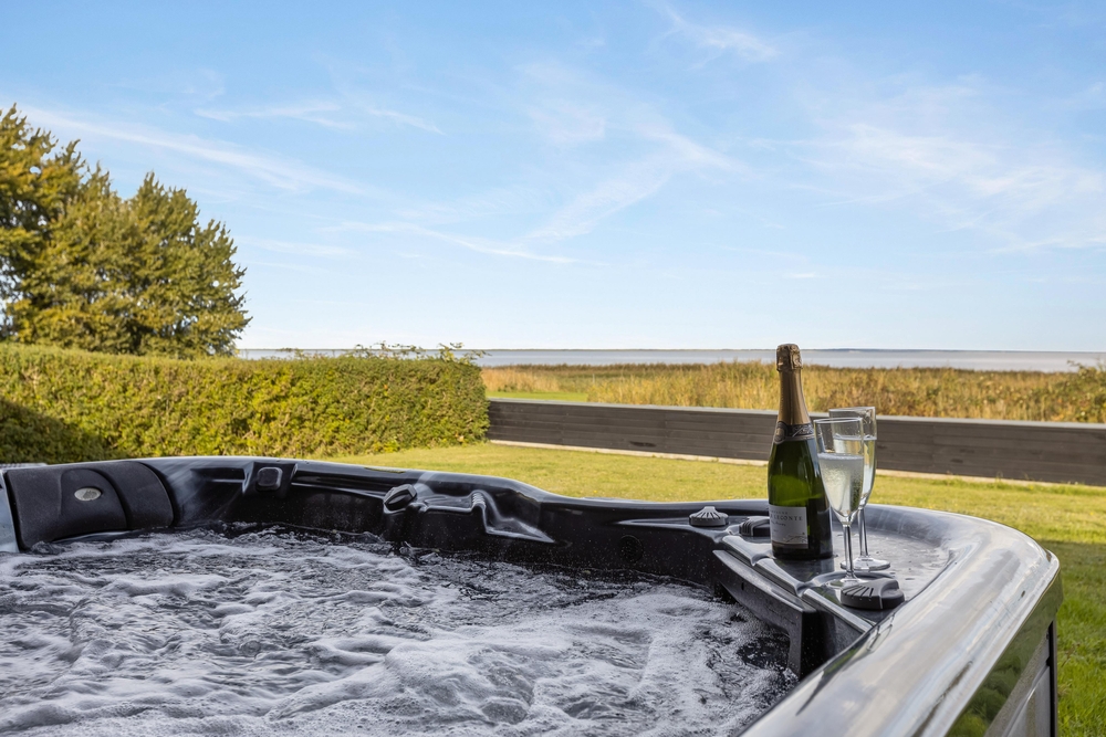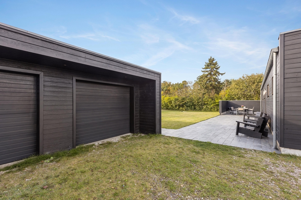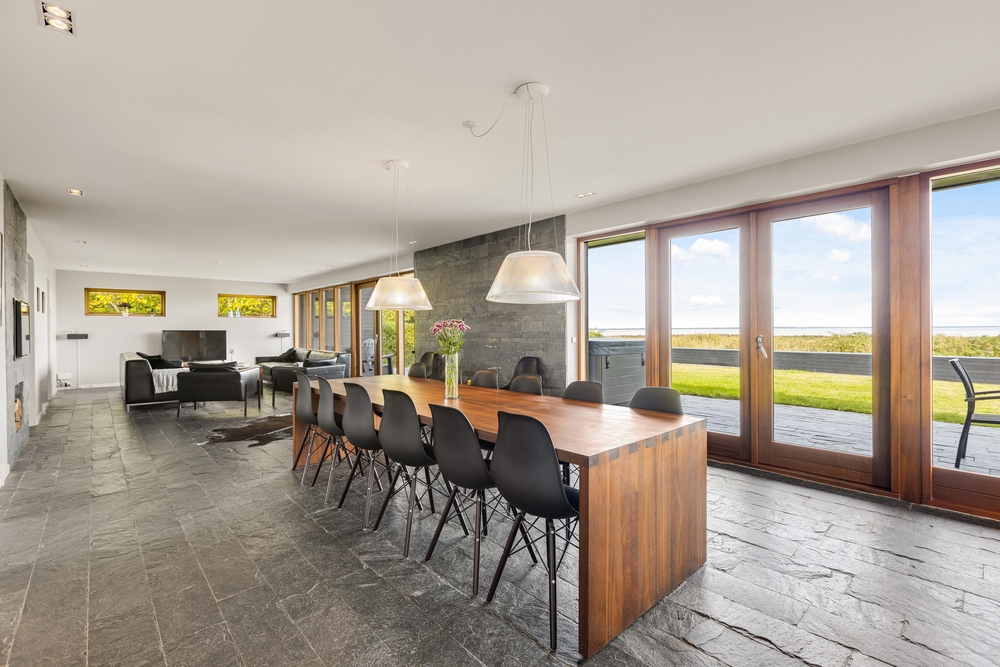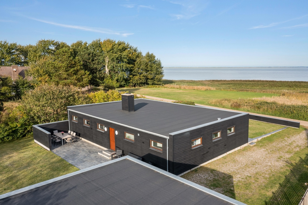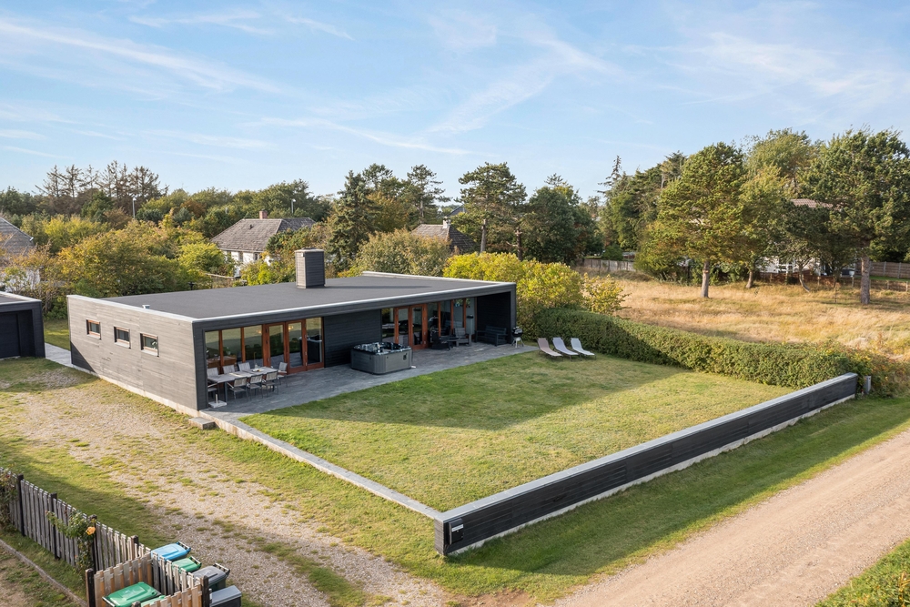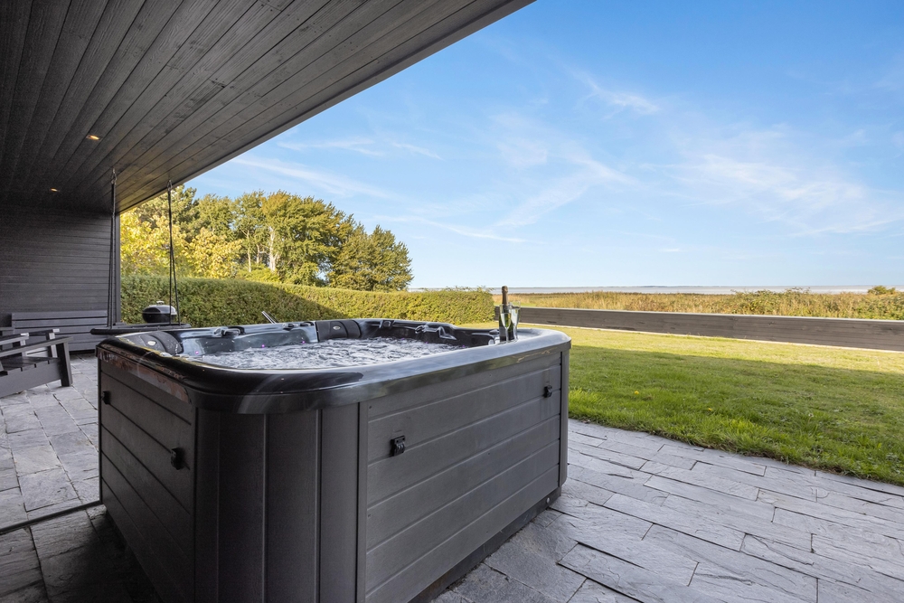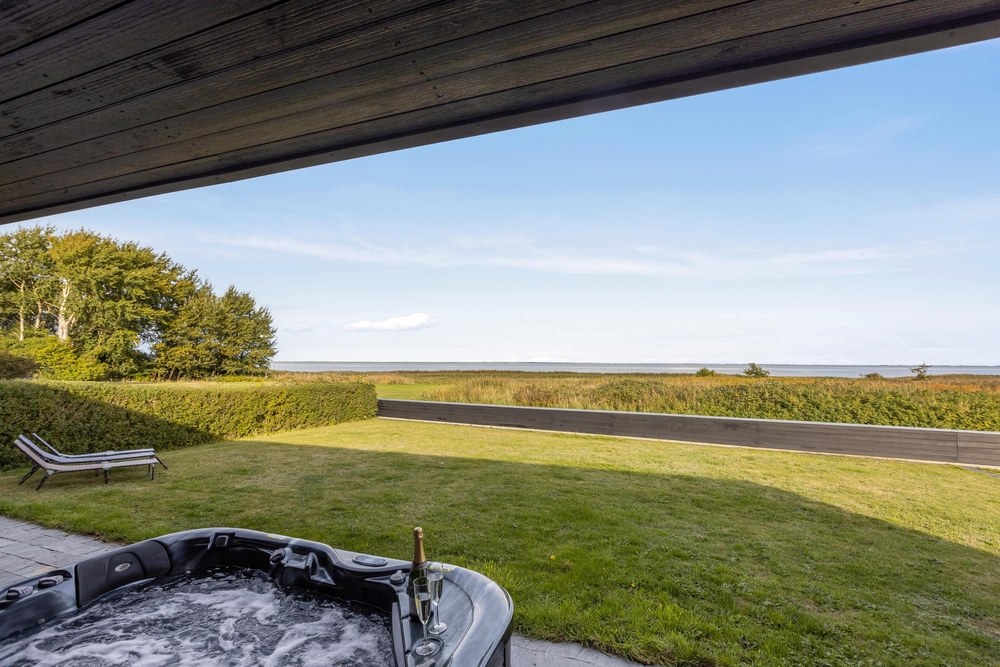 Der große Außenbereich des Ferienhauses ist mit einer großzügigen Rasenfläche ausgestattet. Ideal, um sich auszutoben oder für eine Partie Wikingerschach. Die teilweise überdachte Terrasse bietet sich ideal für einen gemütlichen Grillabend mit der ganzen Familie an. Abends lässt es sich herrlich im Außenwhirlpool entspannen, mit einem guten Glas Wein und einer schönen Aussicht aufs Wasser und in den Sternenhimmel.