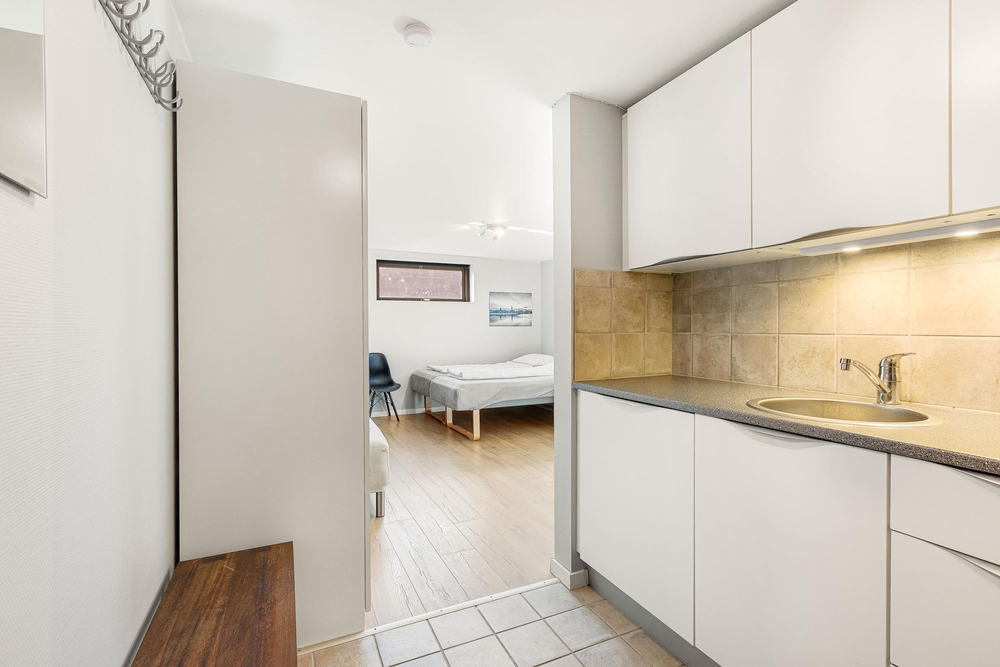 Beim Betreten des Sommerhuses findet man sich direkt im offenen Wohn-Essbereich mit gemütlicher Sofaecke und großzügigem Esstisch wieder. Ideal um abends gemeinsam einen Film zu schauen oder einen Spieleabend zu veranstalten. Die wohlige Wärme des Kamins trägt zur hyggeligen Atmosphäre bei.