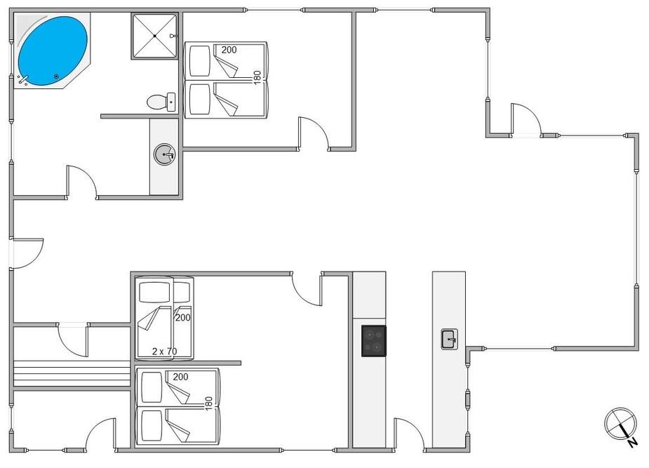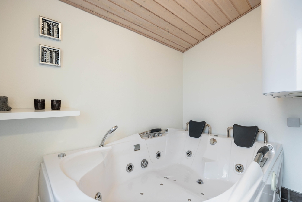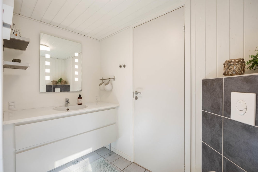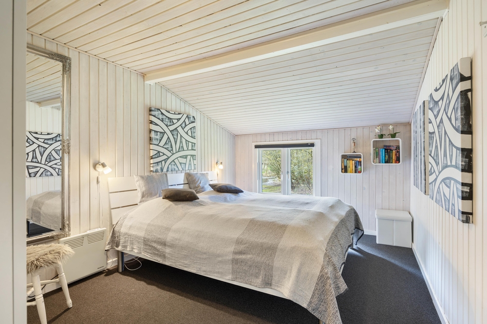 Das Ferienhaus hat zwei Schlafzimmer. Eins mit einem bequemen Doppelbett, und ein Schlafzimmer mit einem Etagenbett und einem Doppelbett hinter einer vorgezogenen Wand. Dieses Schlafzimmer ist perfekt für die Kinder. Das Badezimmer wurde ebenfalls renoviert, hat eine Fußbodenheizung und Sauna. Schaltet vor einem Spaziergang an einem stürmischen Herbsttag die Sauna an, und freut euch anschließend auf eine Wellnessauszeit.
