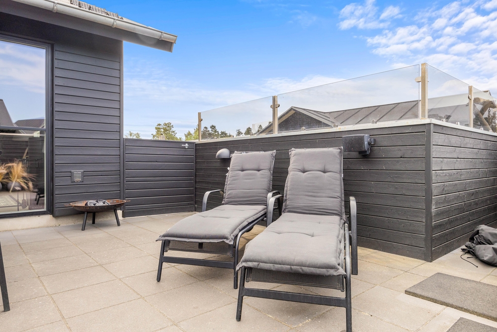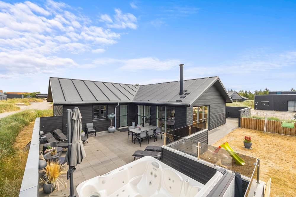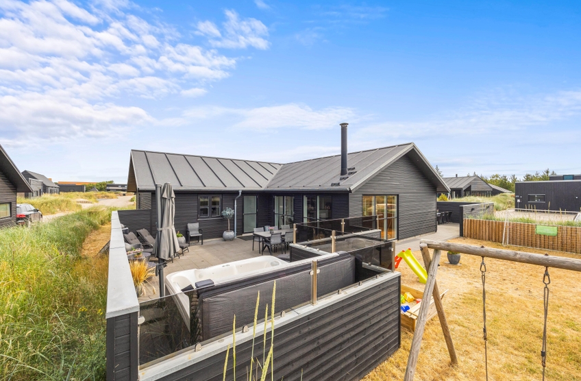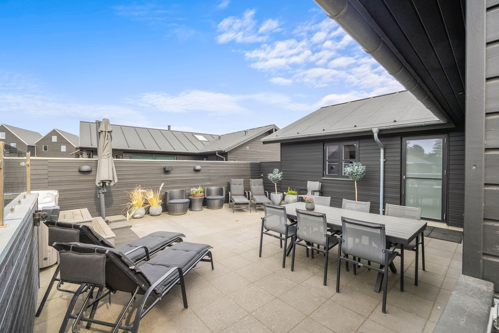 Auf der umzäunten Terrasse befindet sich eines der absoluten Highlights des Hauses; nämlich der große Außenwhirlpool mit Platz für 4-6 Personen. Vergesst also nicht die Badebekleidung, damit ihr ganzjährig im warmen Whirlpool unter freiem Himmel relaxen könnt!