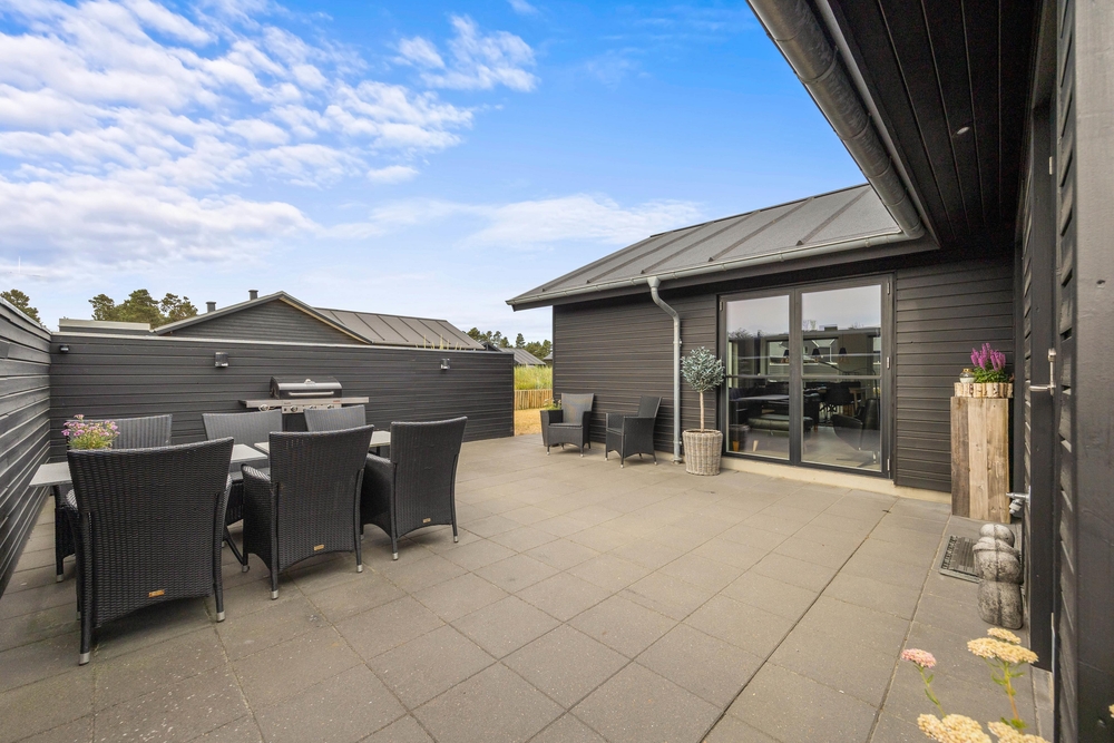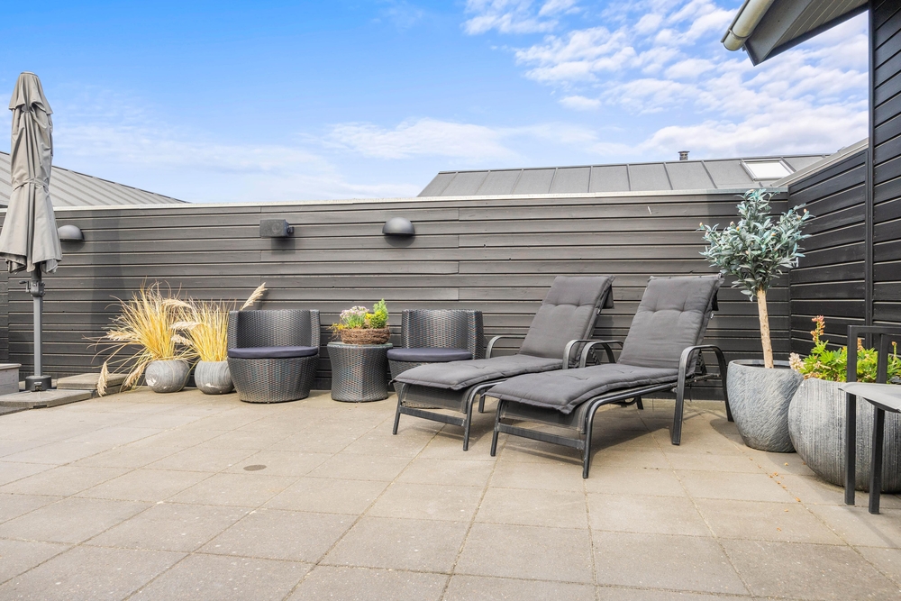Rund um das Haus befinden sich zwei gute Terrassen nach Osten und Westen. Während eine Terrasse abgeschirmt ist, ist die andere komplett geschlossen, sodass die Kinder sicher spielen können, während ihr auf den Sonnenliegen entspannt oder auf dem Grill rin Abendessen vorbereitet.