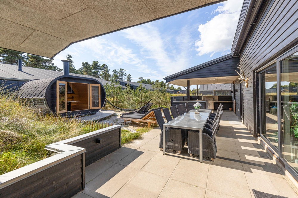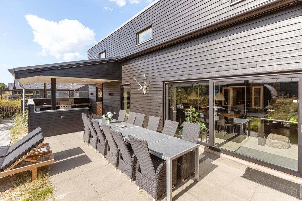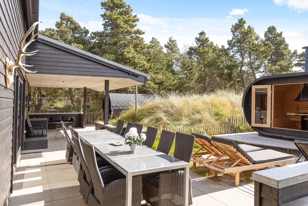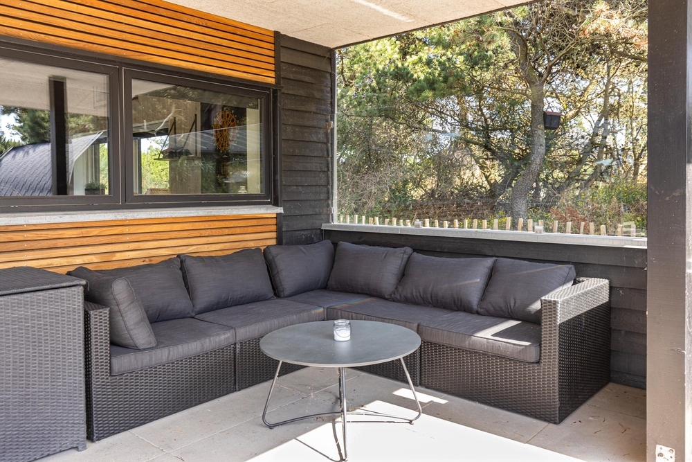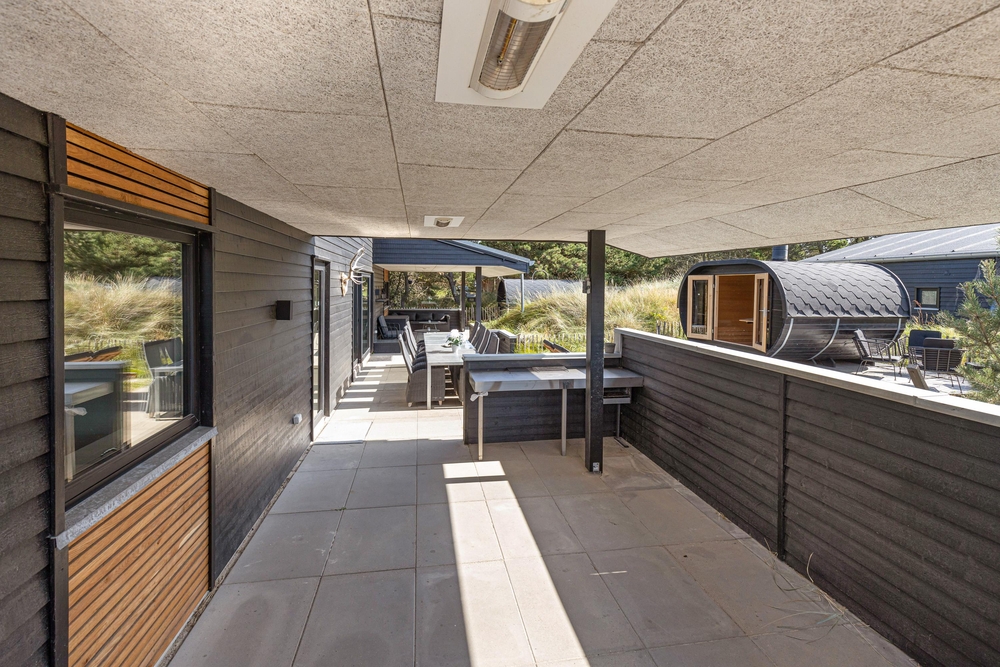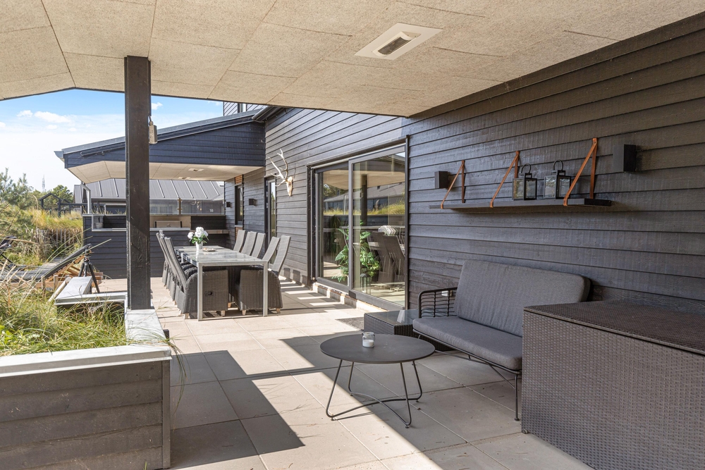 Sowohl der Innen- als auch der Außenbereich des Ferienhauses wurde bis ins Detail durchdacht, sodass euch für einen gelungenen Urlaub an nichts fehlt. Die große Terrasse hat sowohl einen überdachten, abgeschirmten und einen offenen Bereich, und ist mit gemütlichen Lounge Möbeln ausgestattet.
