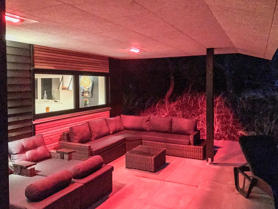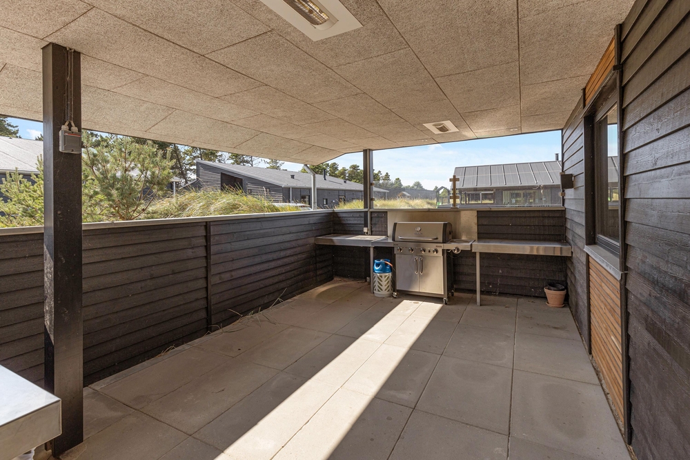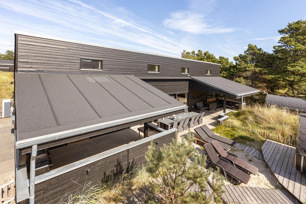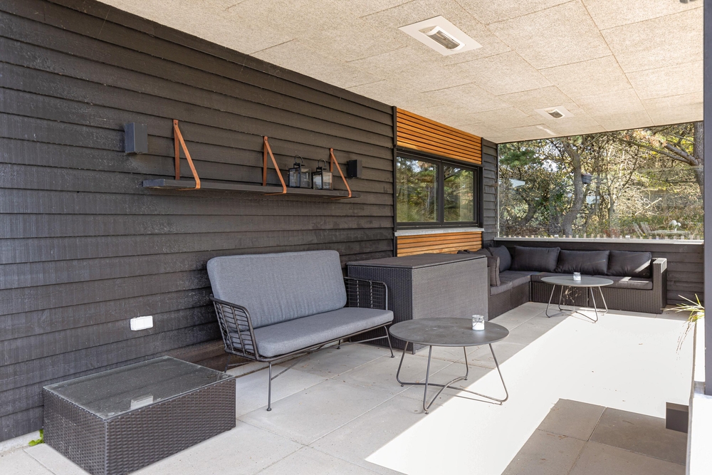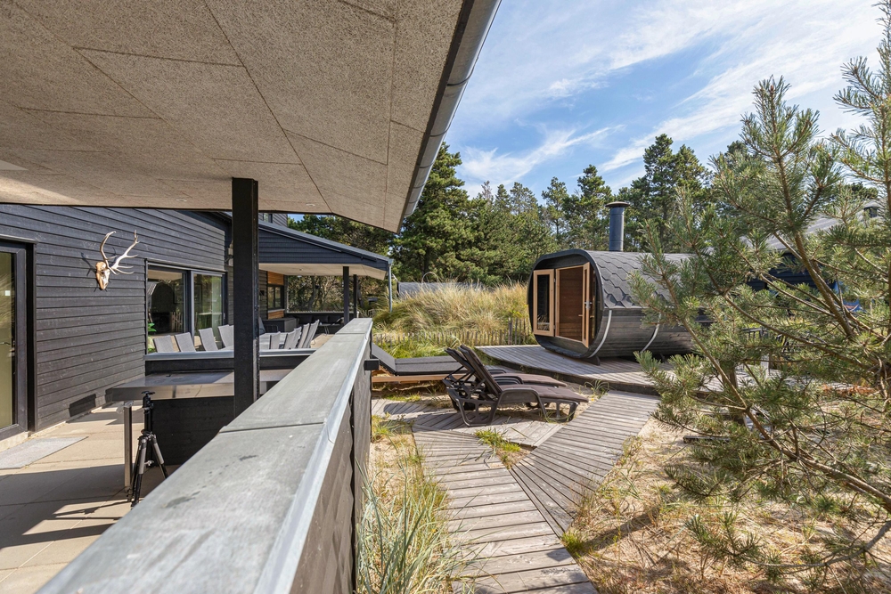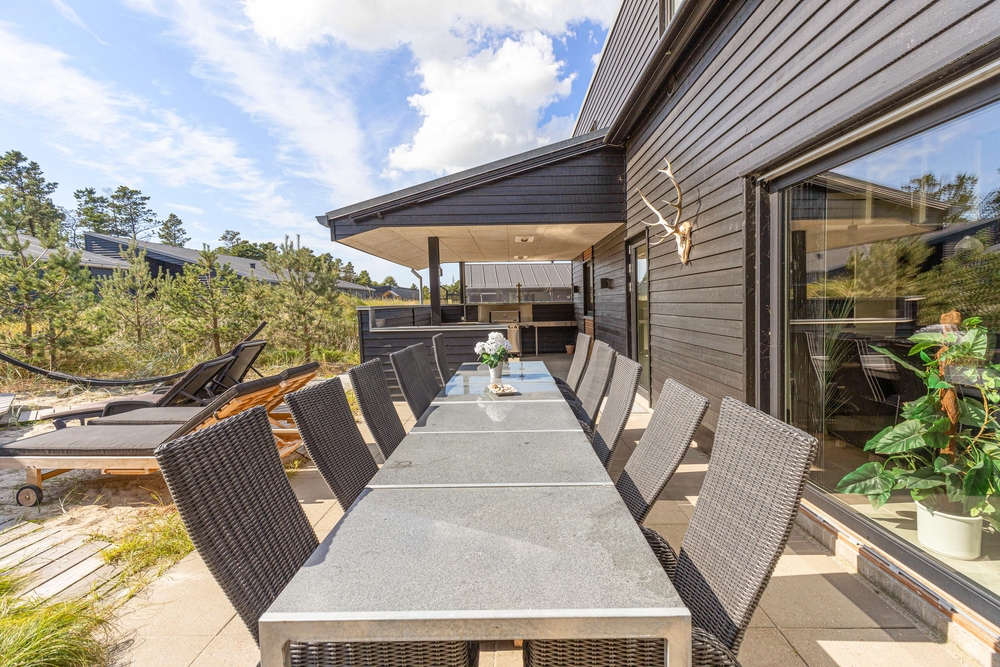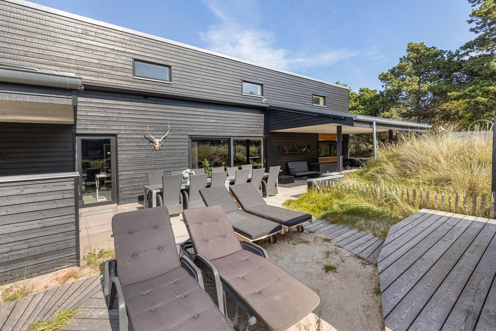 Sowohl der Innen- als auch der Außenbereich des Ferienhauses wurde bis ins Detail durchdacht, sodass euch für einen gelungenen Urlaub an nichts fehlt. Die große Terrasse hat sowohl einen überdachten, abgeschirmten und einen offenen Bereich, und ist mit gemütlichen Lounge Möbeln ausgestattet.