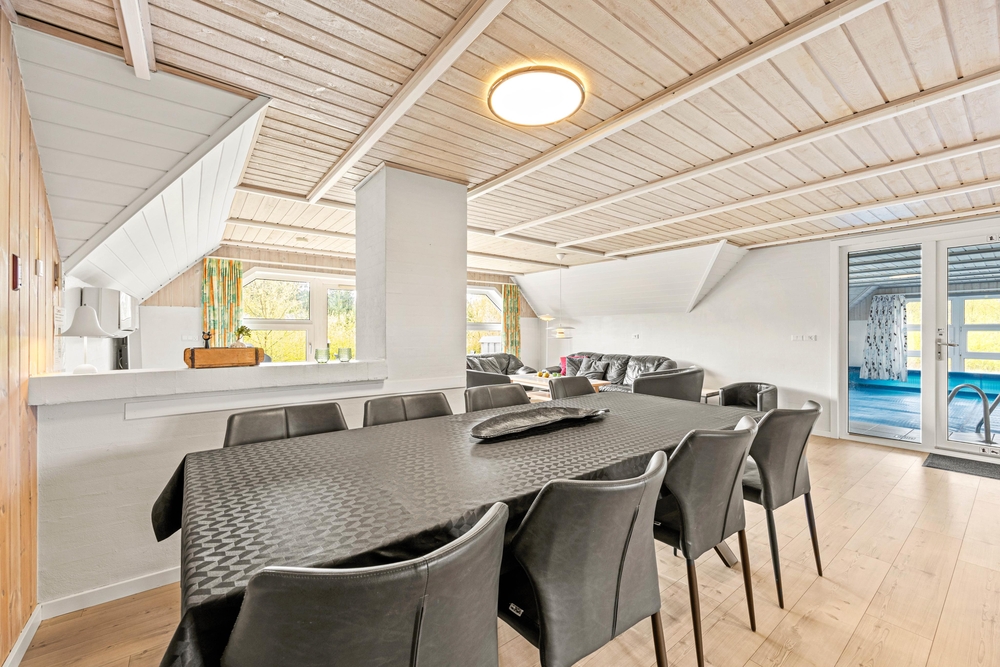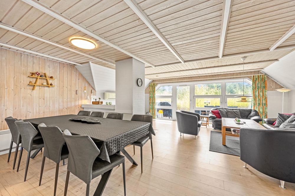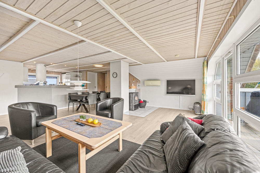 Von der Haustür aus betritt man zunächst den Flur, in der sich sowohl die Waschmaschine als auch der Wäschetrockner befinden. Der große Wohnbereich mit offener Küche und Essbereich folgt direkt zur Rechten. Hier könnt ihr es euch abends mit Brettspielen und der Wärme des schönen Holzofens gemütlich machen. Außerdem kann das Ferienhaus auch mit der energiesparenden Wärmepumpe geheizt werden.
