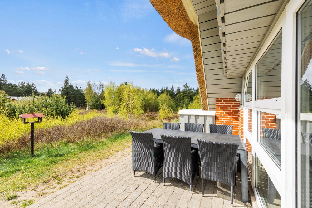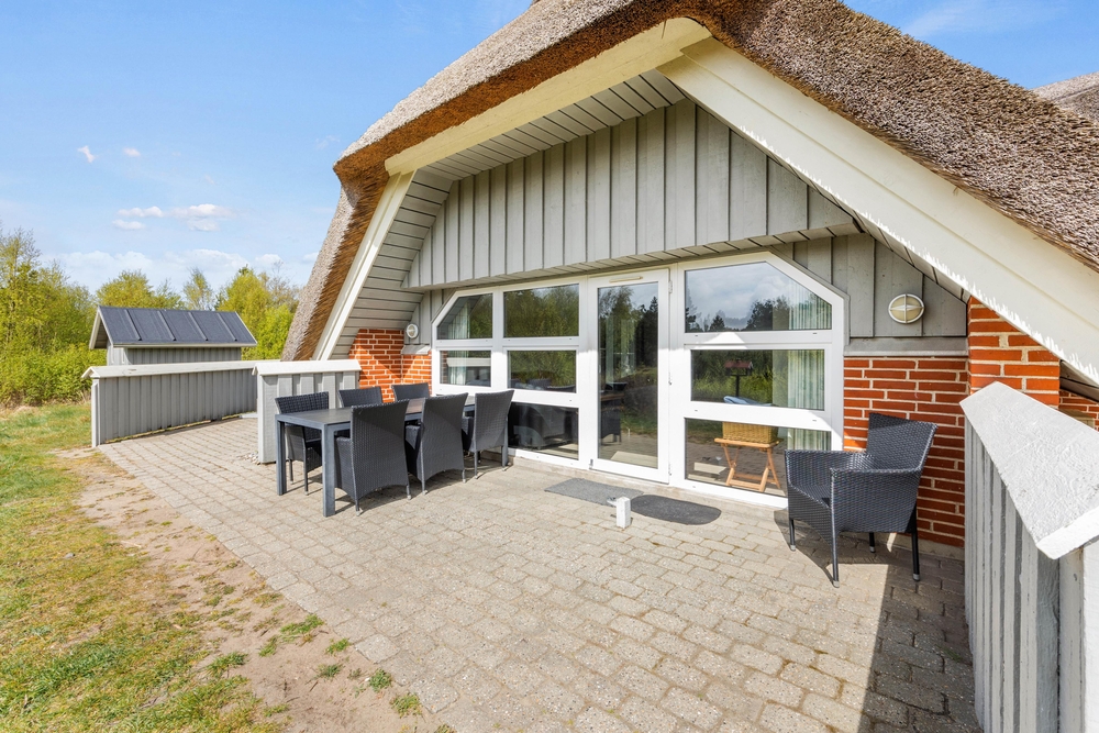 Vom Wohnbereich aus hat man Zugang zur offenen Terrasse des Ferienhauses. Hier könnt ihre viele sonnige Stunden auf den bequemen Gartenmöbeln genießen, während die Kleinen auf der Schaukel des Hauses oder im Sandkasten spielen können.