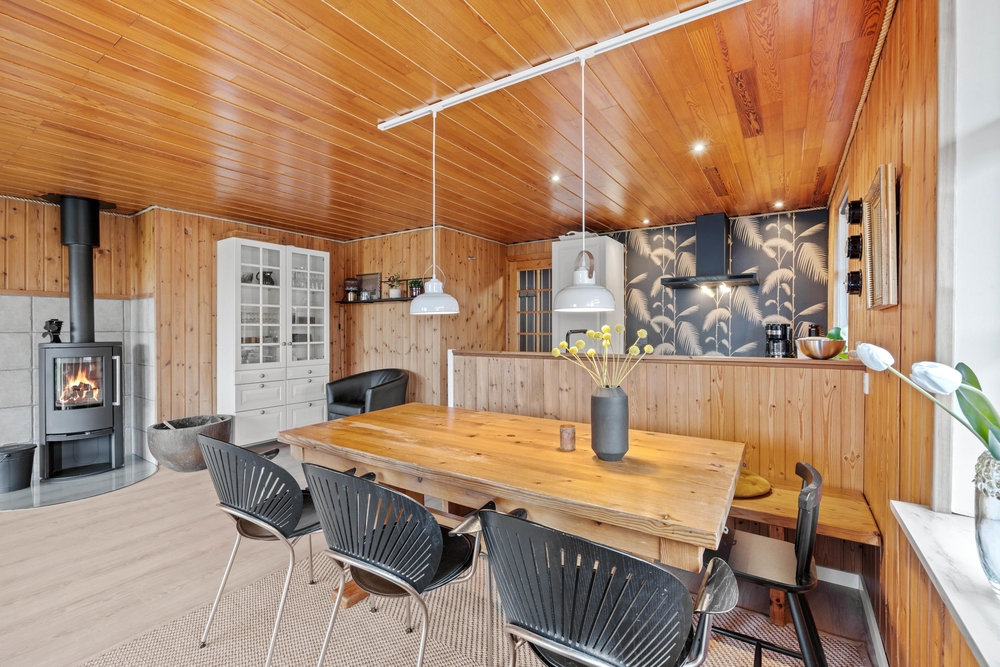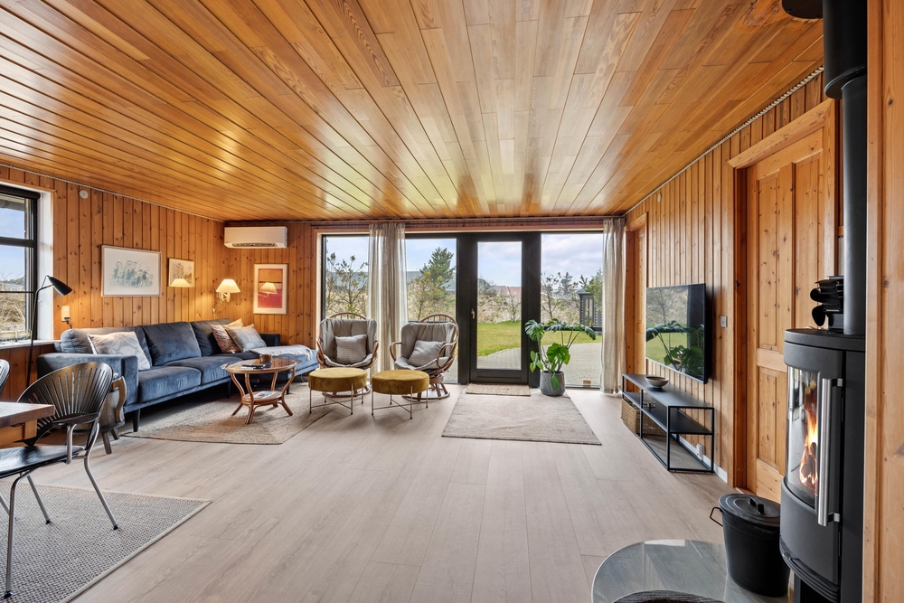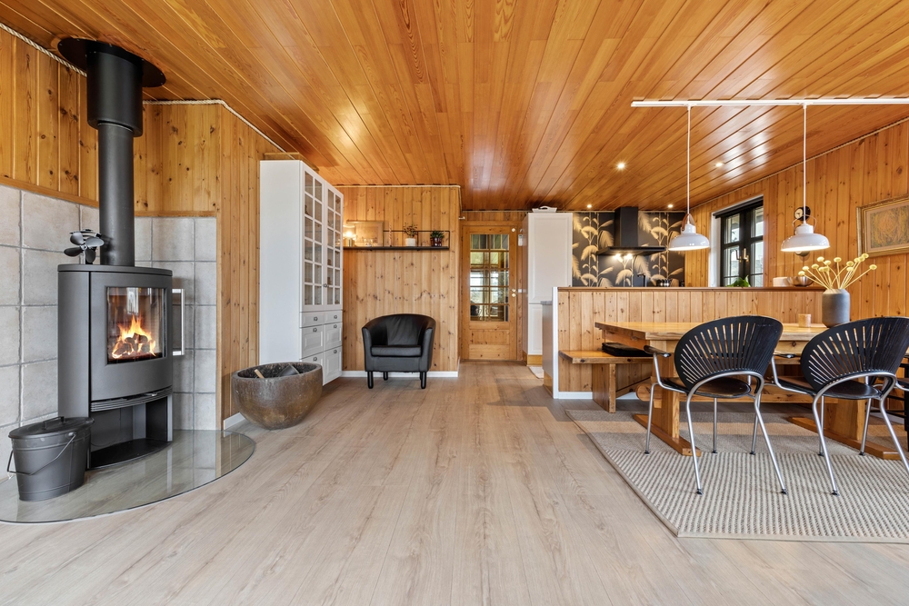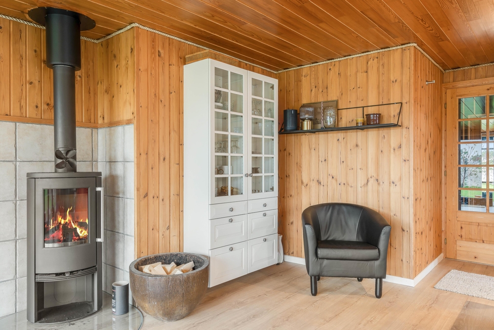Für die gemütliche Urlaubsatmosphäre im Familienzimmer sorgt den Holzofen, der im Hintergrund knistert und gute Wärme im Raum verbreitet. Zusätzlich gibt es im Ferienhaus eine energiesparende Wärmepumpe, die für gute Raumtemperaturen sorgt.