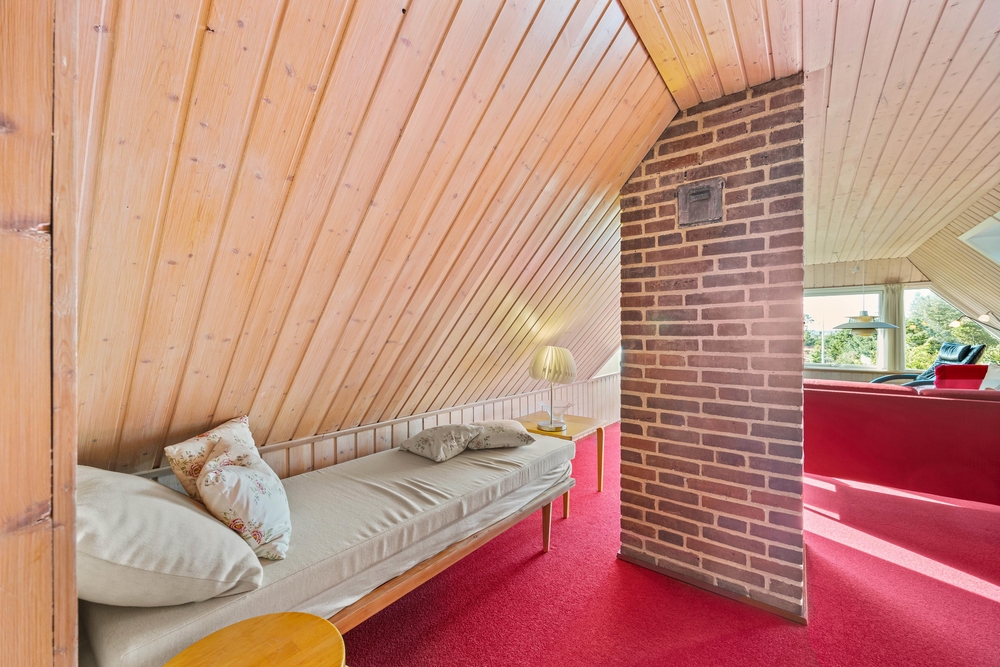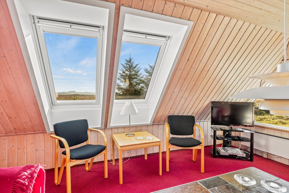 Eine Treppe führt euch vom Erdgeschoss hinauf in ein weiteres gemütliches und schön eingerichtetes Wohnzimmer. Die Fenster sorgen für schönes Licht, aber auch von hier könnt Ihr die wunderschöne Aussicht auf die Heide/Dünenplantage geniessen.