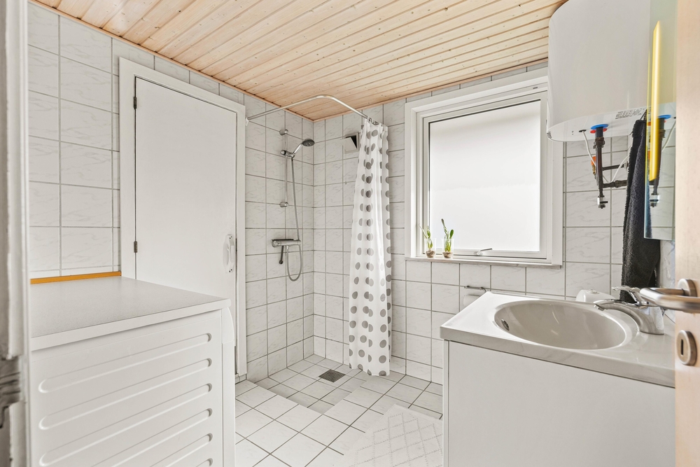Vom schönen Badezimmer, das mit Fußbodenheizung versehen ist, gibt es Zugang zur geräumigen Sauna, die Ihr nach einem herrlichen Spaziergang entlang des Strandes, der nur 700 m von diesem Sommerhaus entfernt ist, nutzen könnt.