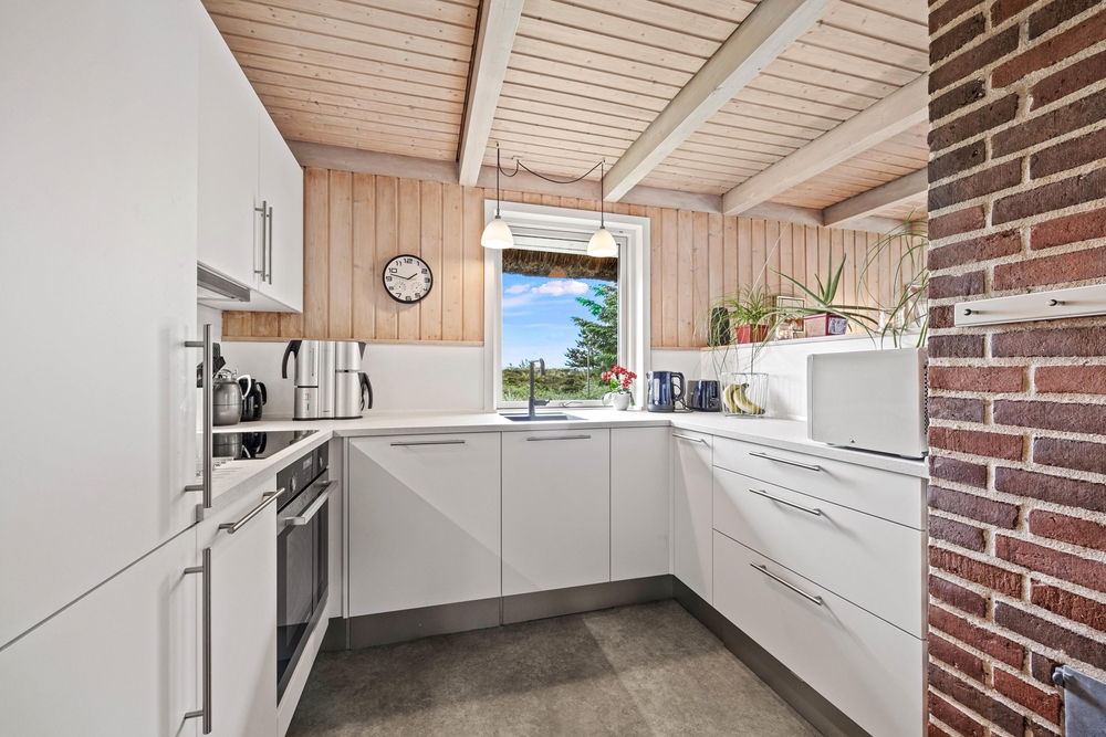 Vom Wohnzimmer, sowie auch vom Esszimmer, die beide gemütlich eingerichtet worden sind, geben die Fenster viele schöne Blicke auf die Heide. Die gut ausgestattete Küche enhält sowohl einen Geschirrspüler, als auch einen separaten Gefrierschrank von 80 l.