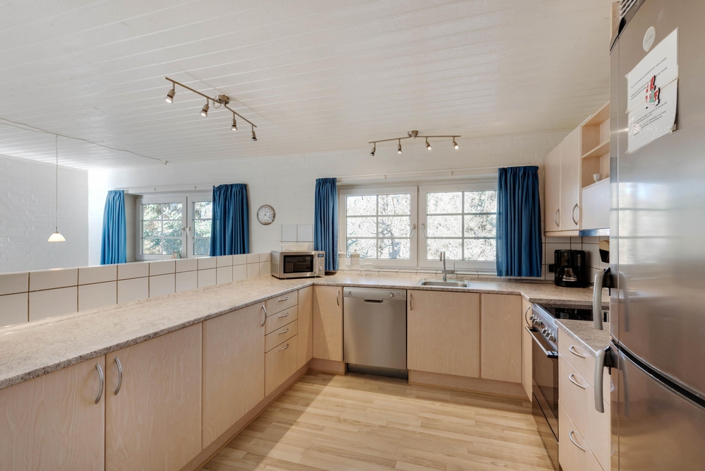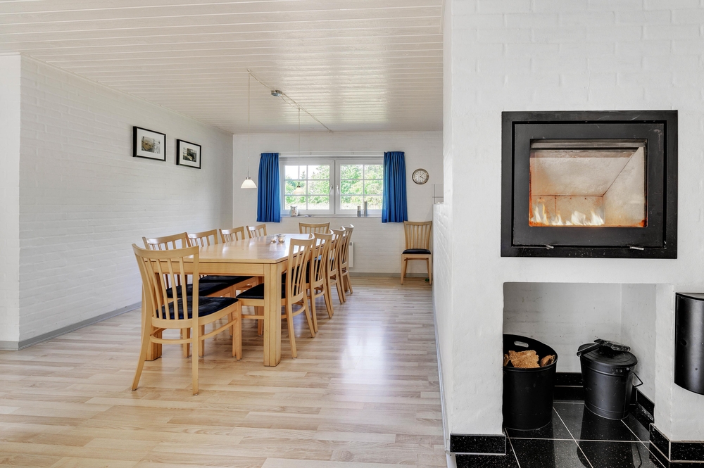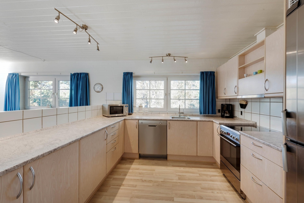 Nach einem ausgelassenen Tag an der frischen Luft oder einer Zeit im Pool könnt ihr euch auf dem Sofa entspannen, während nebenan in der offenen Küche gekocht wird. Auch der Esstisch ist im großen Aufenthaltsraum integriert, ebenso wie der Tischkicker. Zentral jedoch ist der in der Wand eingebaute Holzofen, der Wärme spendet und eine tolle Atmosphäre schafft.