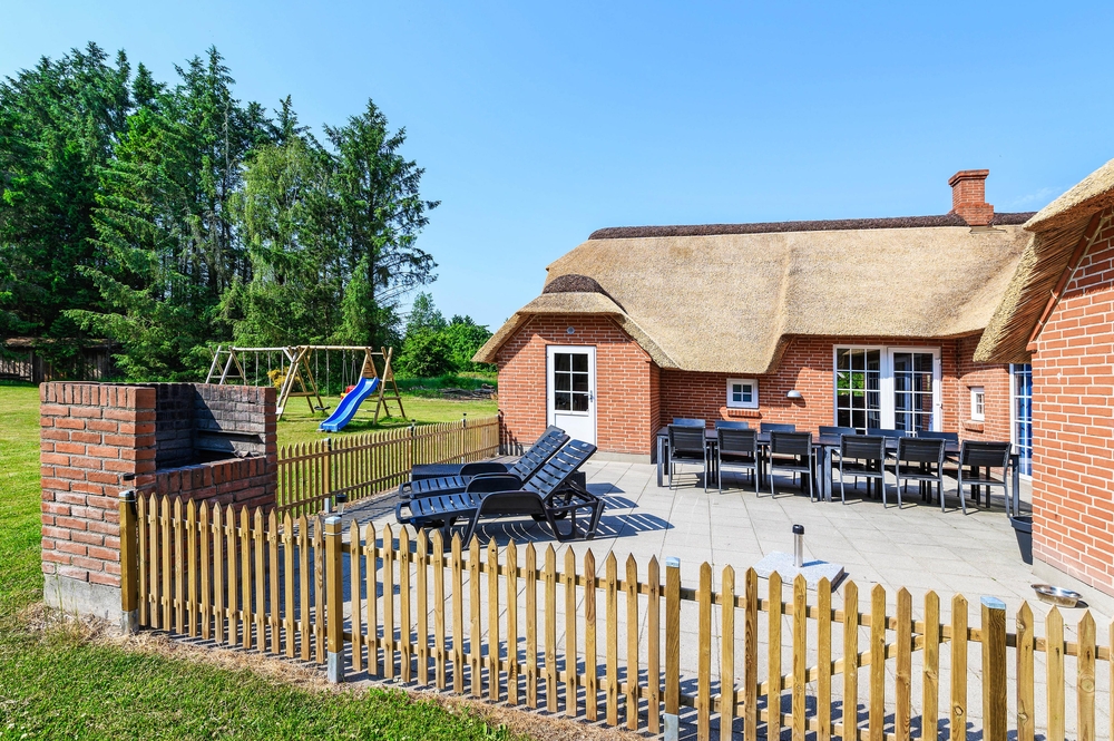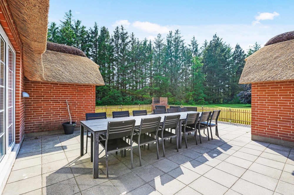 Vom Wohnzimmer aus habt ihr Zugang zu der abgeschirmten Terrasse mit eingebautem Backsteingrill. Hier stehen Gartenmöbel und Sonnenliegen zur Verfügung, damit ihr eure Ferien und die frische Luft genießen könnt. Die Terrasse ist eingezäunt und das gesamte große Grundstück ist von Bäumen eingerahmt, wodurch die Lage völlig abgeschieden ist. Auf dem großen Rasen können die Kinder und Hunde spielen, toben und das Grundstück erkunden.