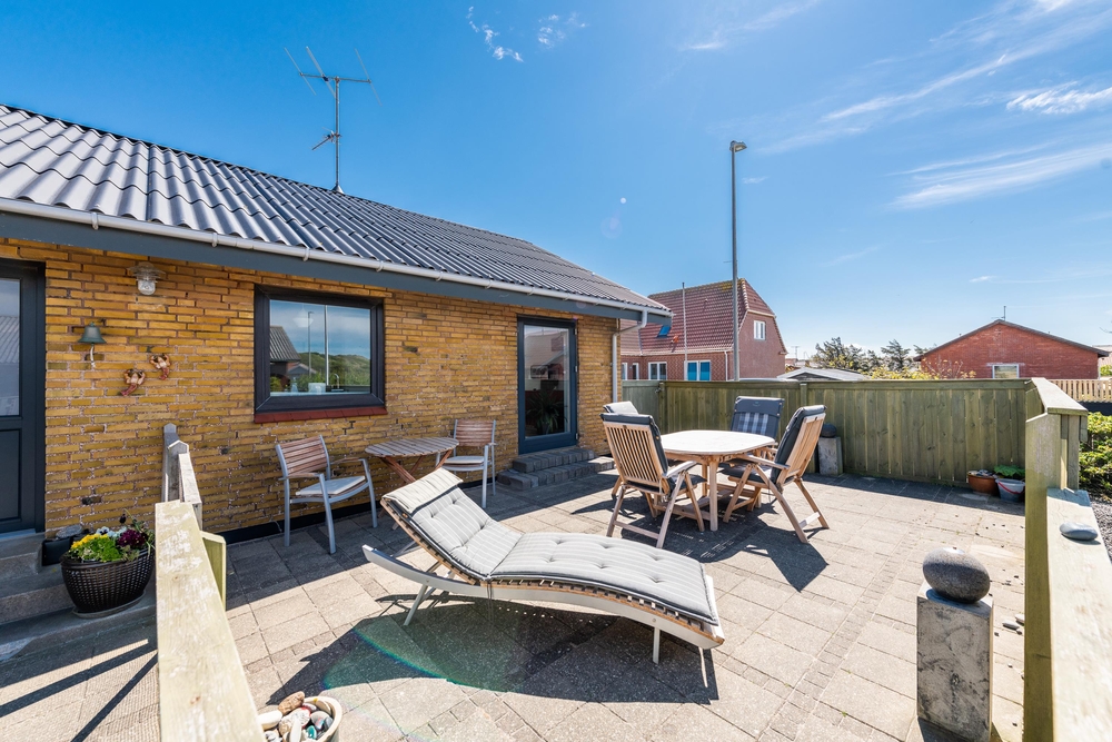 Die geschlossene Terrasse macht es einfach, Kinder und Hunde frei spielen zu lassen, während an einem Sommerabend ein Grillabend und ein guter Rotwein mit Sonnenuntergang und Meeresrauschen im Hintergrund genossen wird.