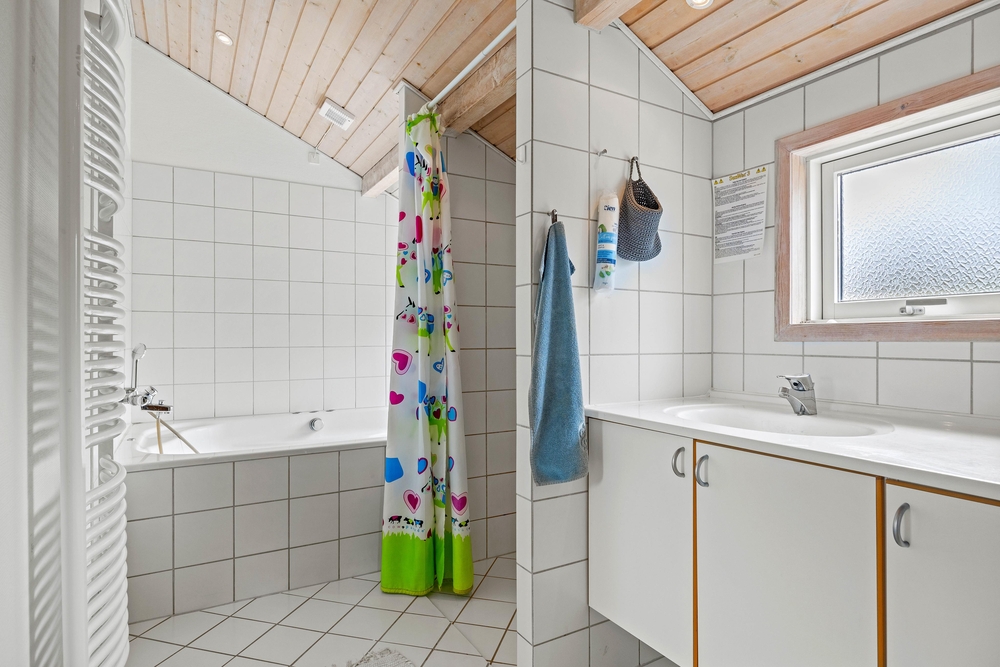 Das schön gelegene Ferinhaus im Grærup Havvej 11 verfügt zudem über ein Badezimmer mit Fußbodenheizung und eine separate Gästetoilette. Eine Waschmaschine und ein Trockner stehen euch ebenfalls zur Verfügung.