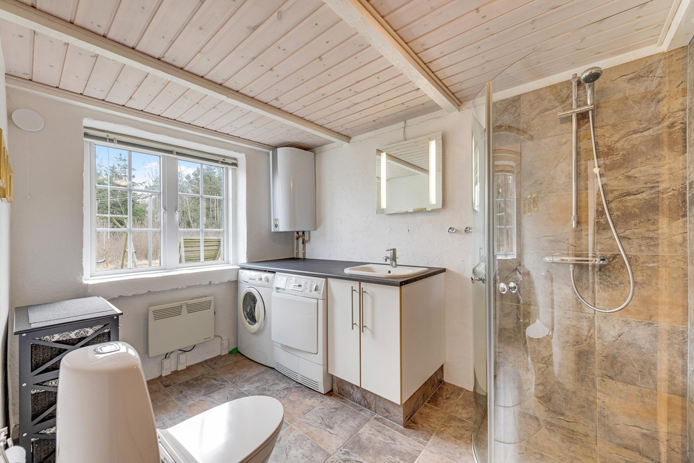 Das Badezimmer des Hauses ist mit einer Fußbodenheizung ausgestattet, besonders morgens beim Zähneputzen ist dies sehr angenehm. Darüber hinaus gibt es hier auch eine praktische Waschmaschine und den Trockner. Frische Kleidung nach einem Standspaziergang mit Wellenkontakt ist also kein Problem.