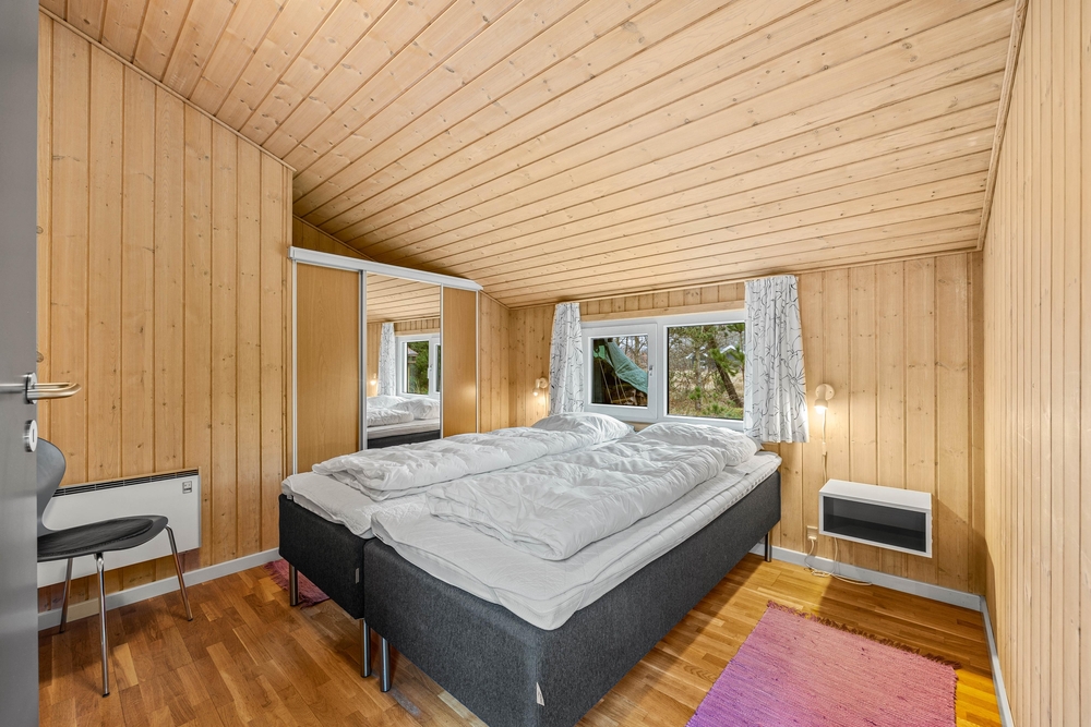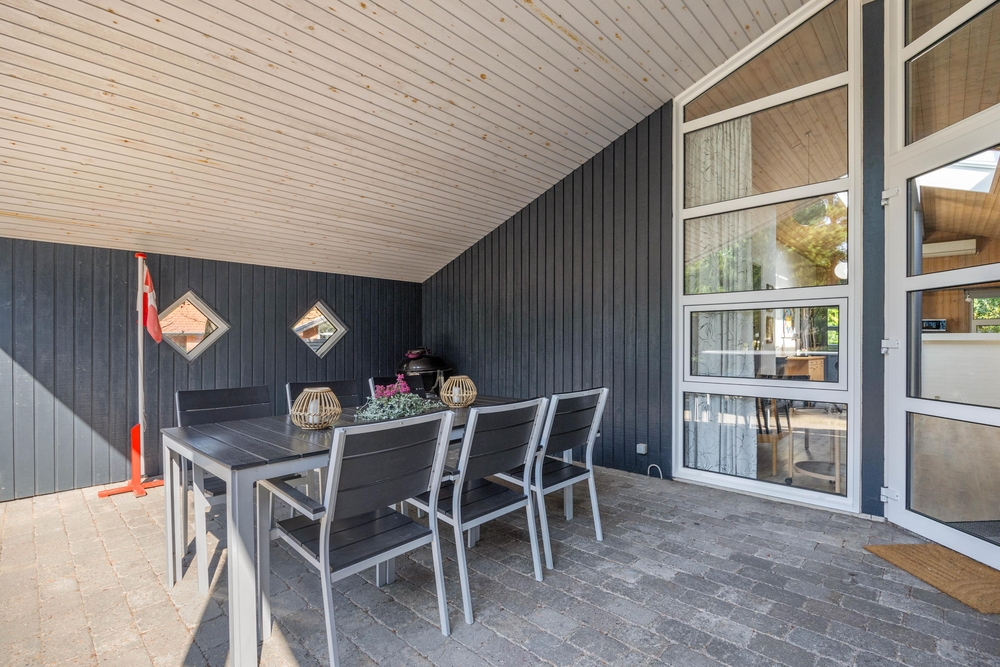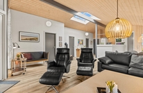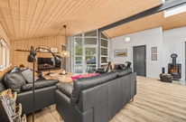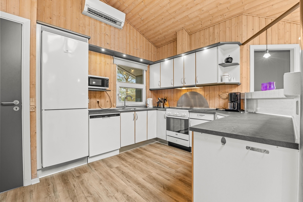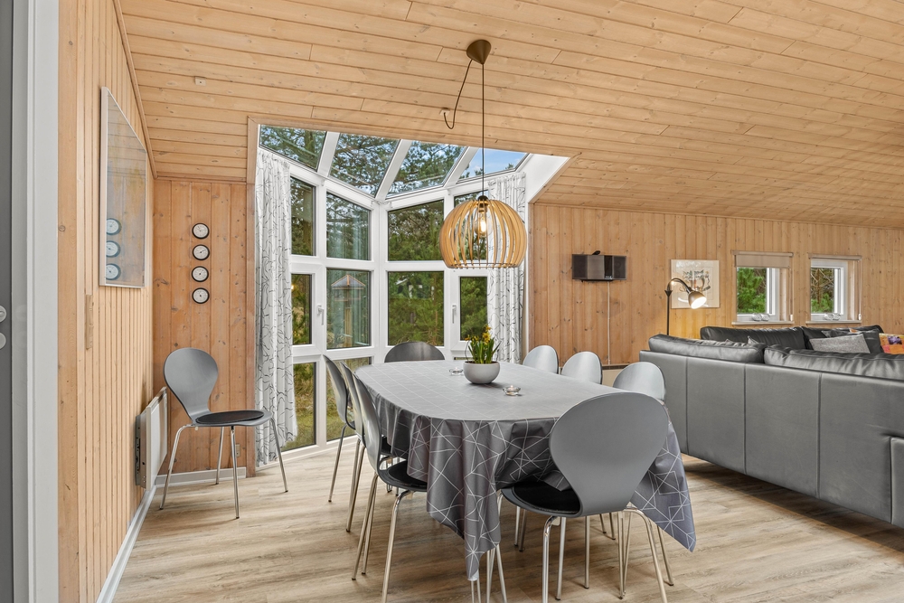 Im Ferienhaus in Grønnevænget 10 A fühlt man sich gleich wie zuhause. Der Mittelpunkt wird sicherlich der helle und mit Holz verkleidete Wohnbereich sein. Hier fließen Tradition und moderne Gestaltung zusammen. Die große Fensterfront lässt nicht nur viel Licht in den Wohnbereich, sondern sorgt auch dafür, dass ihr immer einen freien Blick in den wunderbaren Garten habt. Der Wohnbereich beinhaltete Wohnzimmer, Essbereich und Küche in einem Raum.